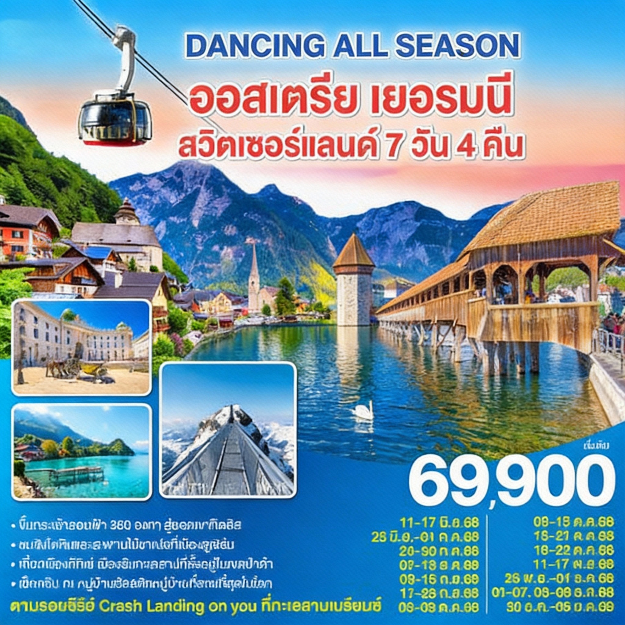 อยากไปยุโรปแบบครั้งเดียวได้ทั้งภูเขาหิมะ เมืองโรแมนติก ทะเลสาบสีฟ้า และช้อปปิ้งแบรนด์เนม? โปรแกรมนี้ออกแบบมาให้คุณ เต้นรำได้ทุกฤดู (DANCING ALL SEASON) 7 วัน 4 คืน จัดเต็มออสเตรีย–เยอรมนี–สวิตเซอร์แลนด์
