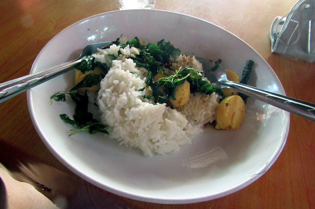 ระหว่างนั่งดูเมนู ท้องก็เริ่มประท้วง เลยจัดเมนูง่าย ๆ แต่โดนใจคือ ข้าวราดเต้าหู้ผัดใบกะเพรา