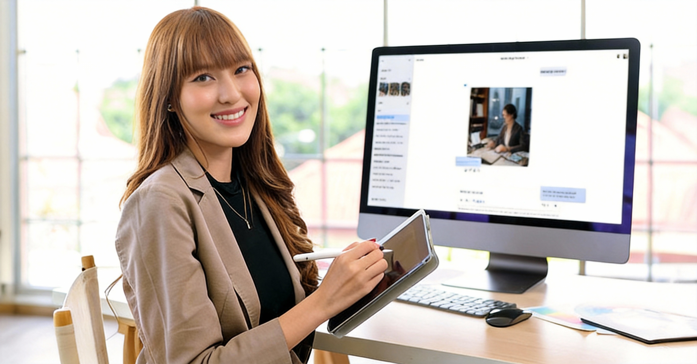 A photograph of a businesswoman confidently giving a presentation in a meeting room. (นักธุรกิจหญิงกำลังพรีเซนต์อย่างมั่นใจในห้องประชุม)