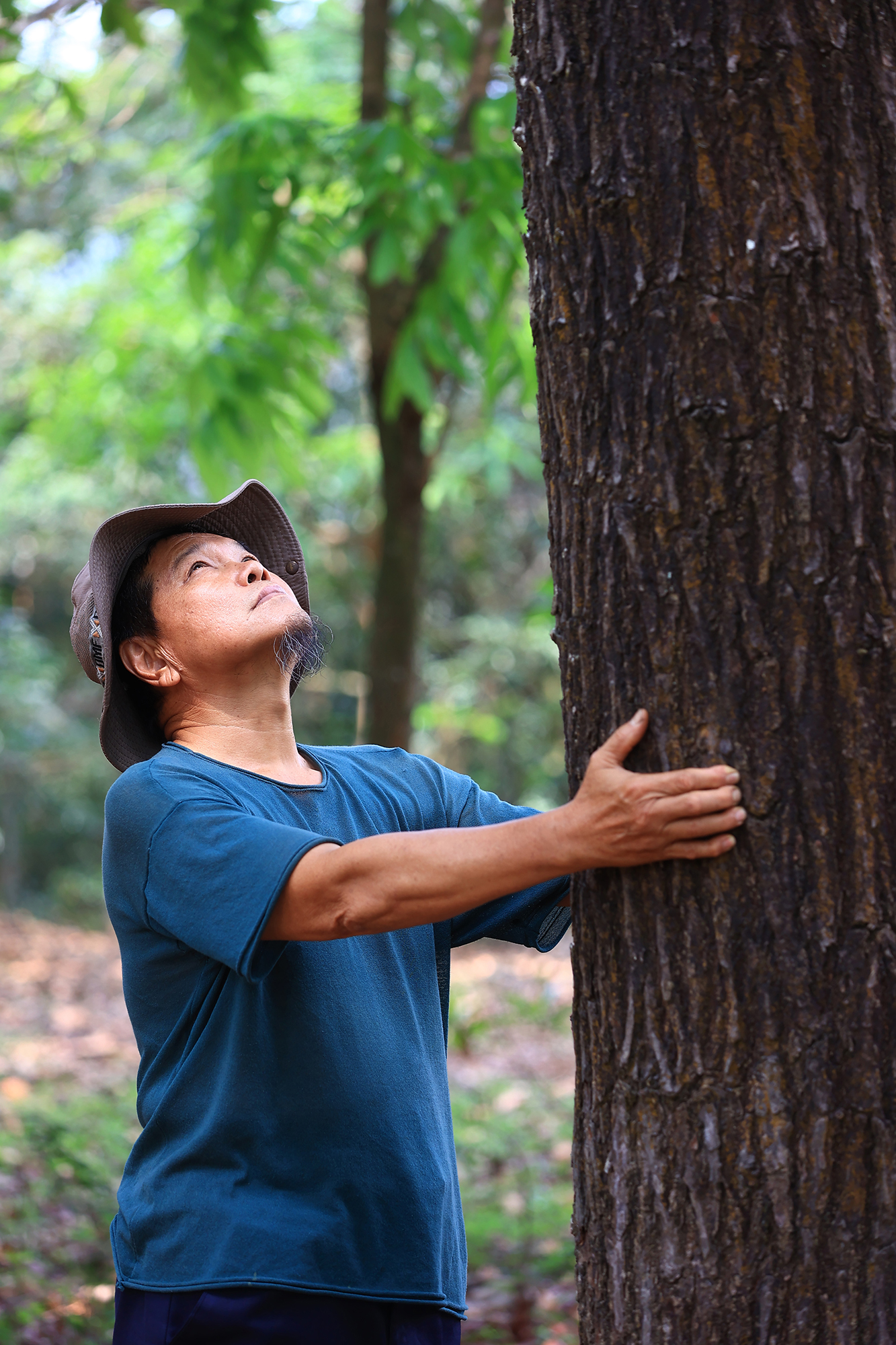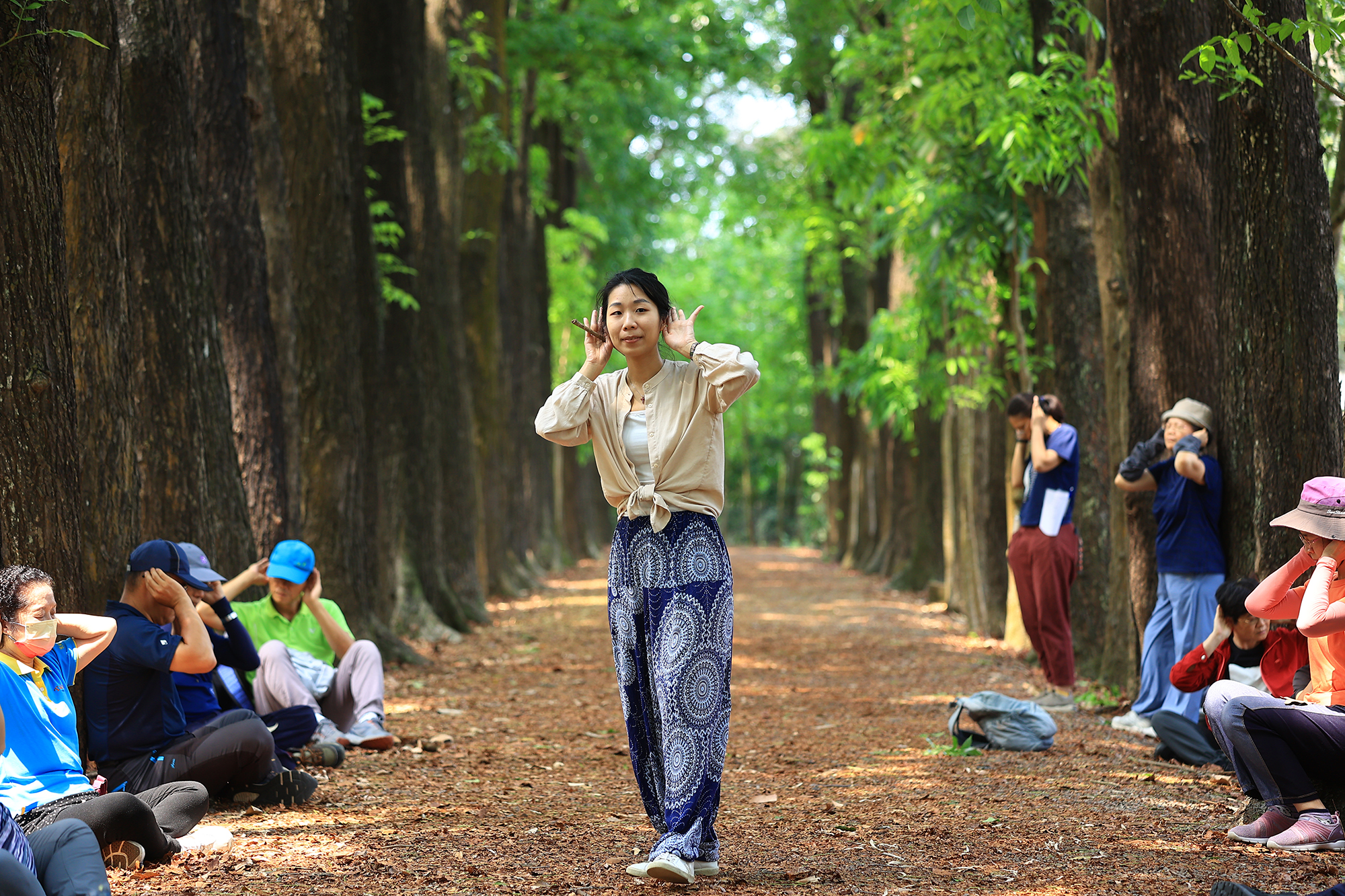 บนเส้นทางเดินป่าต้นมะฮอกกานีในสวนป่าซินเวย เขตทัศนียภาพแห่งชาติเม่าหลิน เมืองเกาสง จัง ถิงเหว่ย ผู้ให้คำแนะนำการบำบัดด้วยป่าและวิทยากรหลักสูตรฝึกนักพนาบำบัดคนแรกของไต้หวันที่ได้รับใบรับรองจาก ANFT สหรัฐฯ ใช้น้ำเสียงนุ่มสงบนำไกด์เดินป่าที่มาฝึกอบรม ให้เปิดประสาทสัมผัสทั้ง 5 และปล่อยตัวเองหลอมรวมเข้ากับขุนเขาลำเนาไพร
