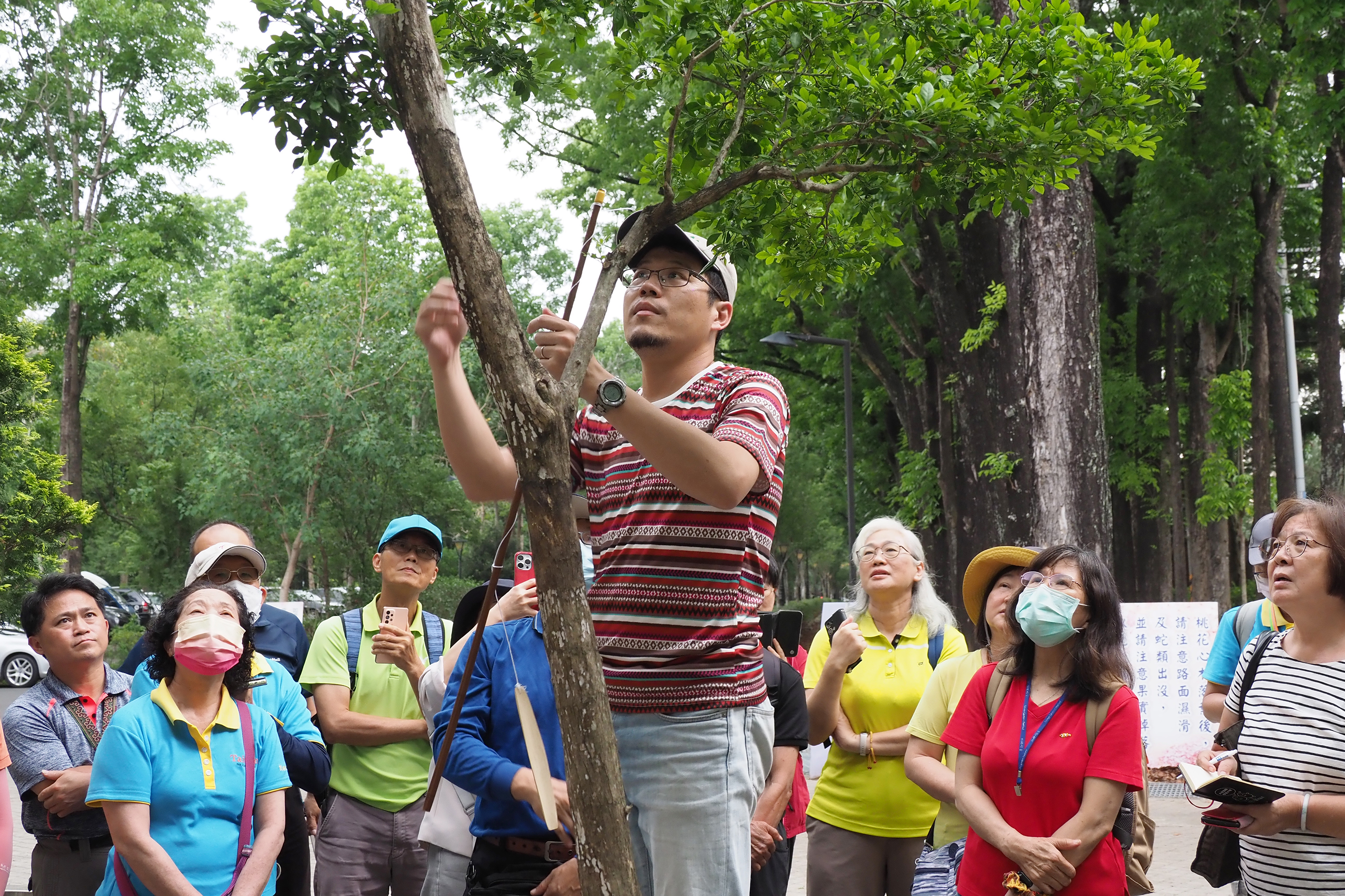 หยาง จื้อข่าย ผู้ช่วยศาสตราจารย์จากมหาวิทยาลัยวิทยาศาสตร์และเทคโนโลยีแห่งชาติผิงตง กำลังสอนกลุ่มผู้นำทางและนักพนาบำบัดให้รู้จักพืชพรรณในป่าอย่างลึกซึ้งยิ่งขึ้น