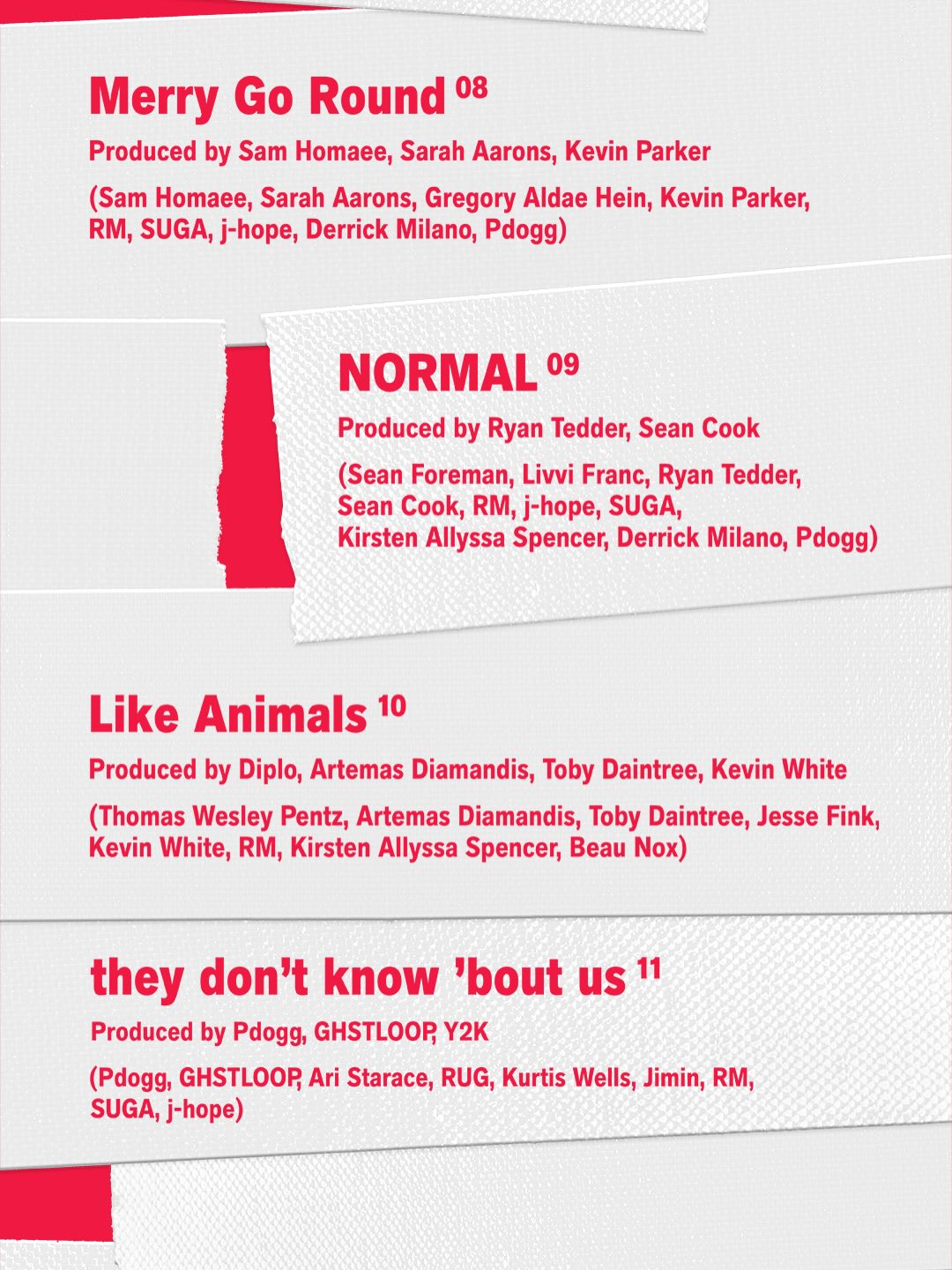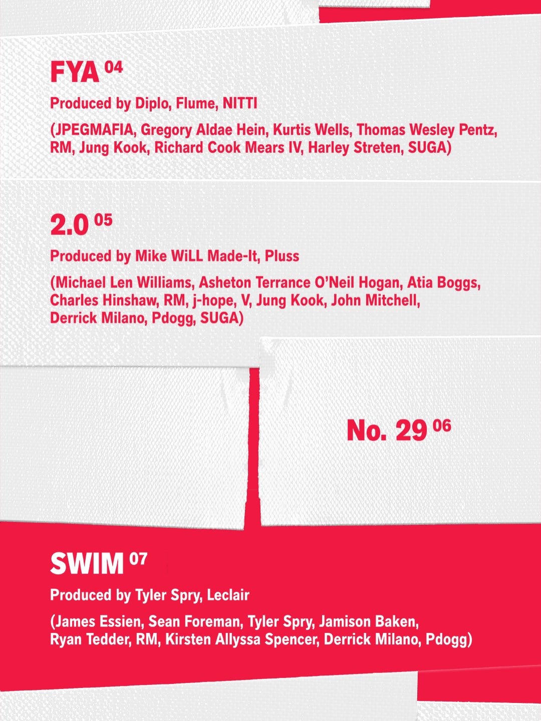 ล่าสุด BTS ได้เปิดเผยรายชื่อเพลงทั้งหมดในอัลบั้ม ซึ่งประกอบด้วย 14 เพลง พร้อมกับการประกาศว่าเพลง SWIM จะเป็นไตเติลแทร็กหลักของอัลบั้มนี้