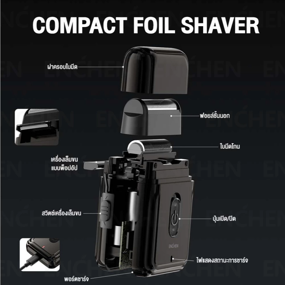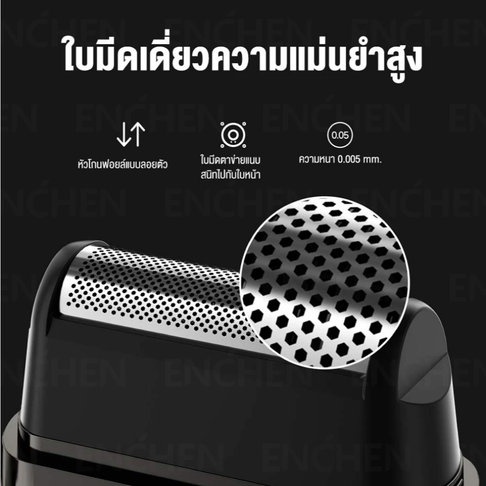 ENCHEN MS003 Electric Shaver คือ เครื่องโกนหนวดไร้สาย แบบฟอยล์ (Foil Shaver) ดีไซน์บางเฉียบ ขนาดเล็กกว่าหน้าจอโทรศัพท์ทั่วไป พกใส่กระเป๋ากางเกงหรือกระเป๋าเดินทางได้แบบไม่กินพื้นที่ จุดเด่นคือการชาร์จผ่าน USB Type-C ที่สะดวก รองรับการใช้งานต่อเนื่องสูงสุดประมาณ 45 นาที หลังชาร์จเต็ม 8 ชั่วโมง