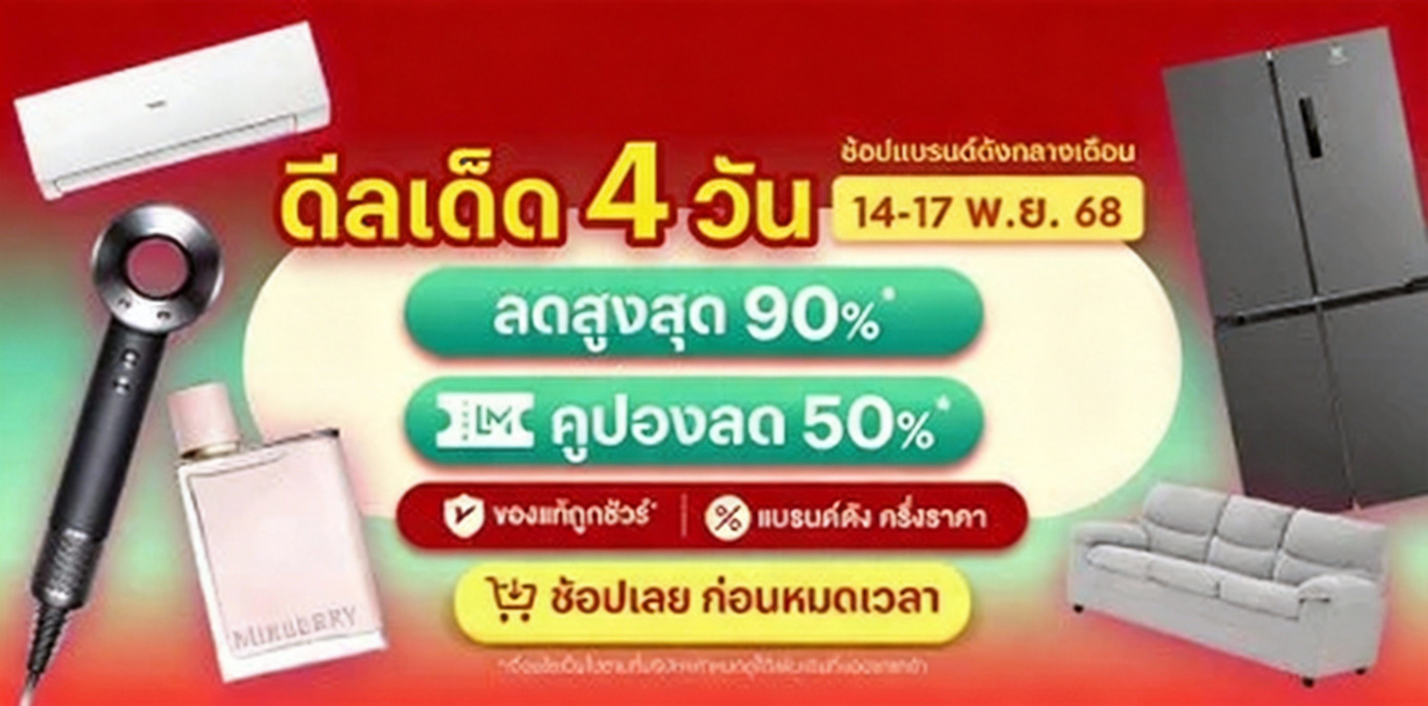 กลางเดือนทีไร กระเป๋าก็เริ่มสั่นทุกที เพราะ Lazada จัดแคมเปญ Mid Month Sale ลดแรงสูงสุดถึง 90%* แถมยังมีโปร ส่งฟรีแบบไม่มีขั้นต่ำ* ให้สายช้อปได้กดเพลิน ๆ ระหว่างวันที่ 14 - 17 พ.ย. 68 ใครเล็งของไว้ บอกเลยว่าช่วงนี้คือจังหวะทอง