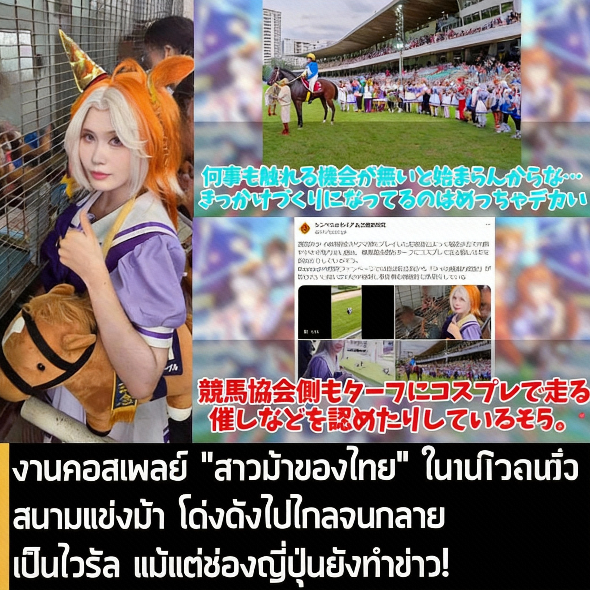 ไฮไลต์ของงานคือการคอสเพลย์เป็น “สาวม้า” จากเรื่อง Umamusume: Pretty Derby ที่ไม่ได้แค่แต่งตัวสวย ๆ ยืนถ่ายรูป แต่ลงไปวิ่งในสนามแข่งม้าจริงเมื่อวันที่ 3 ส.ค. ที่ผ่านมา ทำเอาบรรยากาศทั้งแฟนคอสและคนดูรอบสนามคึกคักสุด ๆ