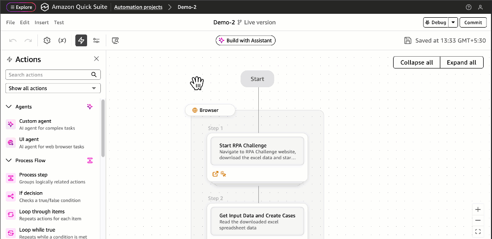 Quick Automate จะสร้างแผนการทำงานอัตโนมัติที่ระบุขั้นตอนและ Action ละเอียดในแต่ละจุด คุณสามารถทำงานผ่าน UI Agent ที่เข้าใจภาษาปกติ เช่น