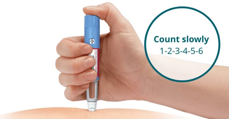 จากนั้น นับต่ออีก 6 วินาที ขณะยังคงกดปุ่มและทิ้งเข็มไว้ใต้ผิวหนัง