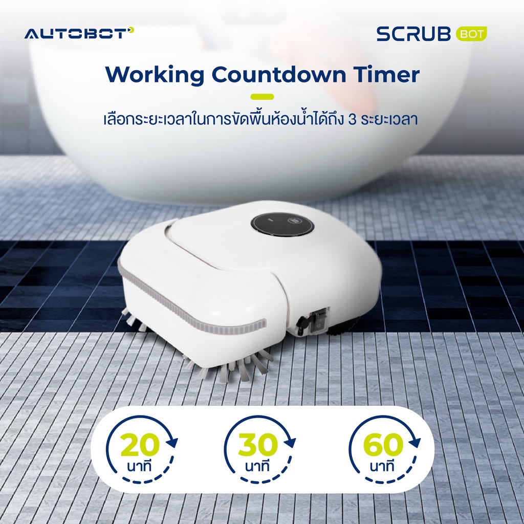 AUTOBOT Scrubbot หุ่นยนต์ขัดห้องน้ำ คืออีกก้าวของนวัตกรรมงานบ้าน ที่ออกแบบมาเพื่อลดภาระการขัดพื้นในพื้นที่เปียกอย่างห้องน้ำและระเบียง ด้วยแรงขัดที่เหมาะสม ระบบการเดินอัจฉริยะ และการรองรับน้ำยาขัดทุกยี่ห้อ