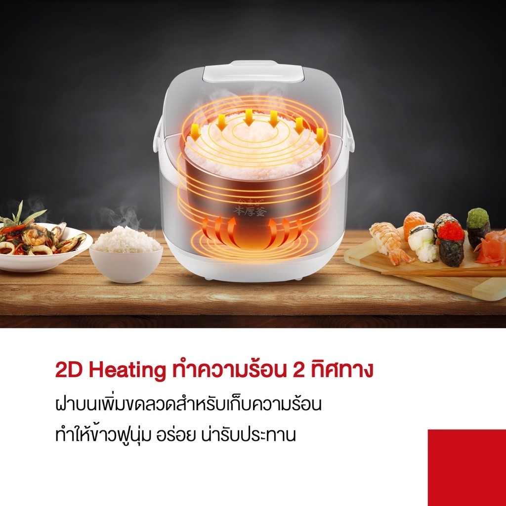 หม้อหุงข้าวรุ่นนี้มาพร้อม ระบบทำความร้อน 2D ที่ให้ความร้อนทั้งจากด้านล่างและฝาบน ช่วยกักเก็บความร้อนภายในหม้อ ทำให้ข้าวสุกอย่างต่อเนื่องและมีเนื้อสัมผัสนุ่มกำลังดี เหมาะกับข้าวหลากหลายประเภท