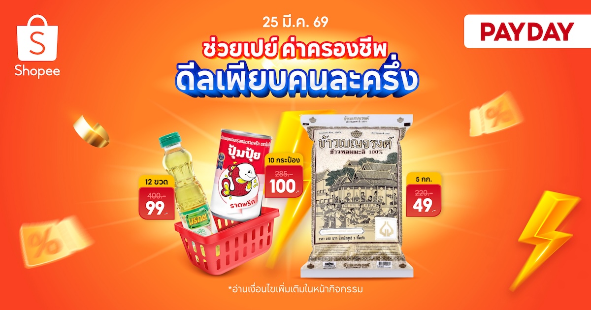 ช้อปปี้ (Shopee) เดินเกมรุกตลาดอีคอมเมิร์ซไทยอีกครั้ง ด้วยการเปิดตัวแคมเปญใหญ่ส่งท้ายเดือนมีนาคม “Shopee Payday ช่วยเปย์ค่าครองชีพ ดีลเพียบคนละครึ่ง” ระหว่างวันที่ 24 - 27 มีนาคม 2569 โดยชูแนวคิดช่วยผู้บริโภคลดภาระค่าใช้จ่ายในช่วงเงินเดือนออก พร้อมขนโปรโมชันจัดเต็มทั้งส่วนลดสูงสุด 80% ดีลคนละครึ่ง และสิทธิพิเศษด้านการจ่ายบิลที่ตอบโจทย์ชีวิตประจำวันอย่างแท้จริง