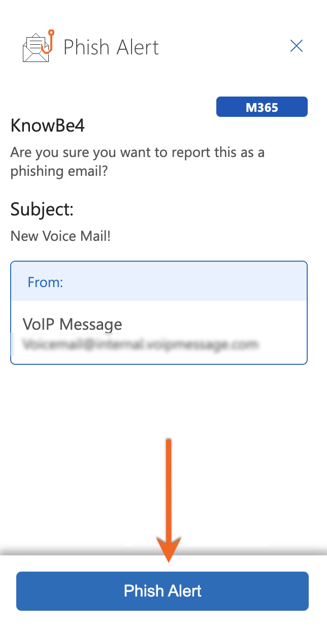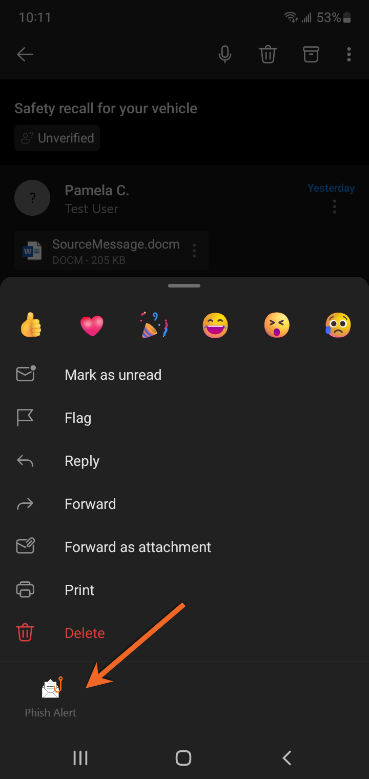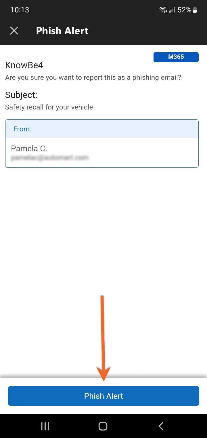 ในหน้าต่างป็อปอัปที่เปิดขึ้น แตะ “Phish Alert” อีกครั้งเพื่อรายงานอีเมล