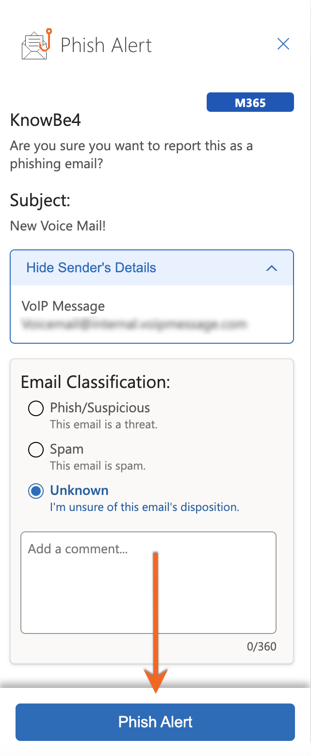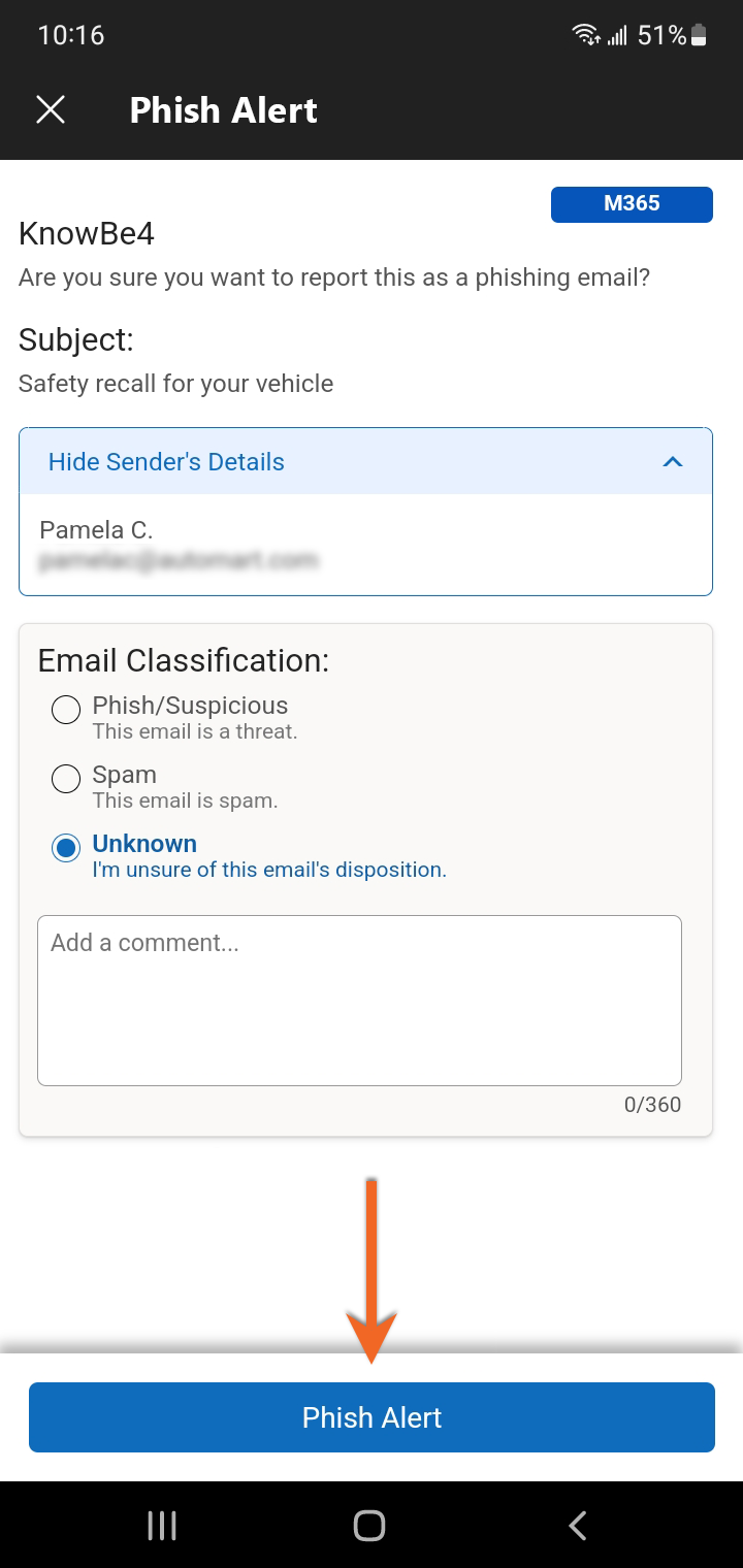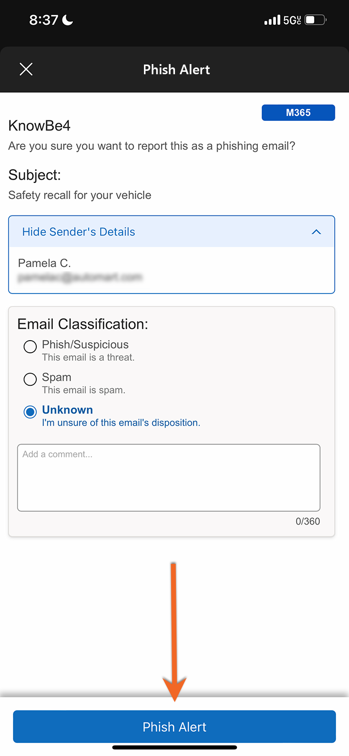 เพิ่มความคิดเห็นของคุณเกี่ยวกับอีเมลนั้นได้ จากนั้นแตะ “Phish Alert” เพื่อยืนยัน