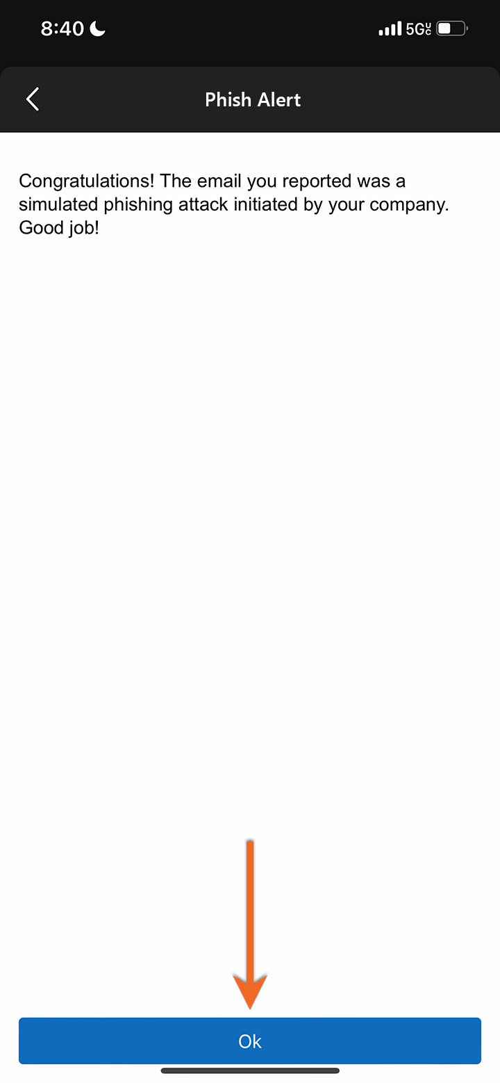 หลังจากแตะ “Phish Alert” อีกครั้ง ระบบจะแสดงข้อความยืนยันว่าอีเมลถูกส่งไปรายงานแล้ว พร้อมแจ้งว่า: