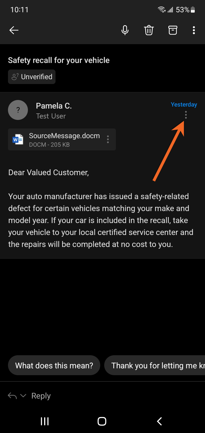 หากคุณใช้งานอีเมลผ่านแอป Microsoft Outlook บน Android สามารถกดรายงานด้วย PAB ตามขั้นตอนนี้: