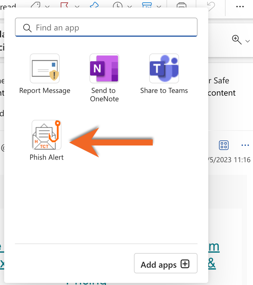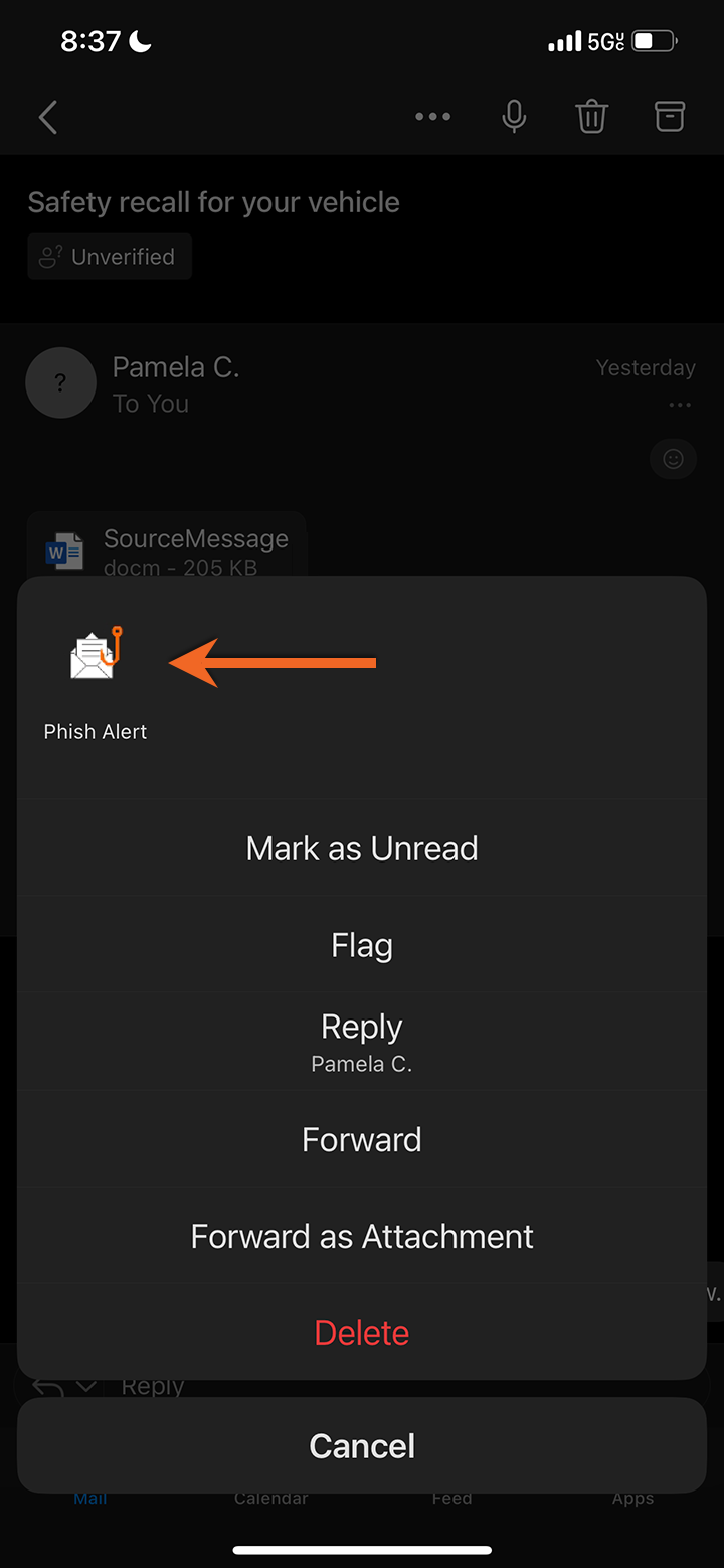 ในหน้าต่างป็อปอัปที่เปิดขึ้น ให้แตะ “Phish Alert” เพื่อรายงานอีเมล