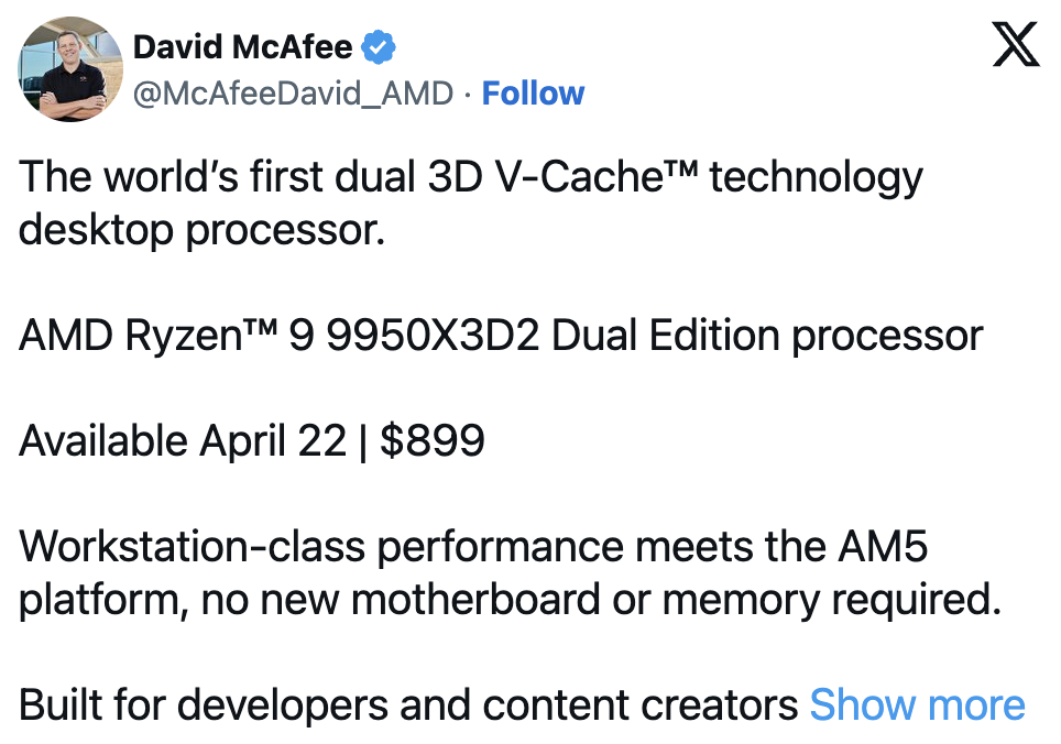 หลังจากที่มีข่าวลือหนาหูเกี่ยวกับ "อสูรกาย" ตัวใหม่ในวงการ CPU ล่าสุดเมื่อวันที่ 8 เมษายน 2569 ทาง David McAfee ผู้บริหารของ AMD ได้ออกมายืนยันราคาและวันวางจำหน่ายของ AMD Ryzen 9 9950X3D2 "Dual Edition" อย่างเป็นทางการผ่านเว็บไซต์ Wccftech และช่องทางโซเชียลมีเดีย โดยเปิดตัวมาที่ราคา $899 (ประมาณ 32,900 บาท ไม่รวมภาษี) ซึ่งถือเป็นสถิติใหม่ของ CPU ตระกูล Ryzen ที่มีราคาสูงที่สุดเท่าที่เคยมีมา