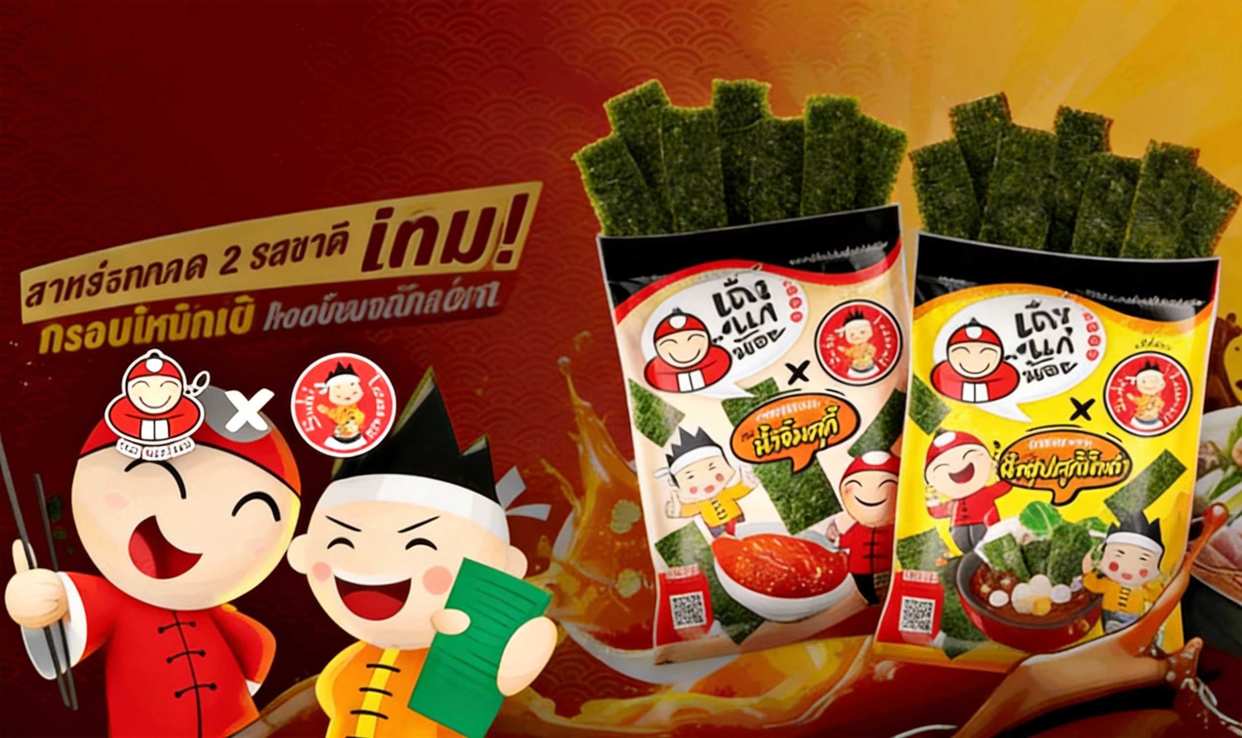 คราวนี้ไม่ได้แค่เอารสชาติแบบเดิม ๆ มาใส่ซอง แต่ยกเอา ซิกเนเจอร์ของทั้งสองแบรนด์ มาผสมกันจนกลายเป็น สาหร่ายทอดเถ้าแก่น้อย 2 รสชาติใหม่ ที่ตั้งใจออกแบบมาให้กินเพลินแบบไม่ต้องรอนั่งหน้าหม้อ
