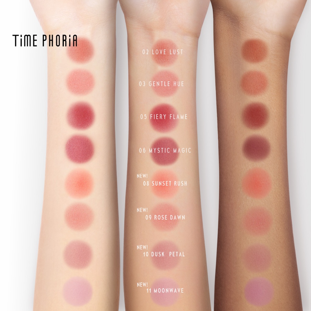 Time Phoria Pandora Cheek Liquid Blush มีให้เลือกทั้งหมด 8 เฉดสี ครอบคลุมตั้งแต่โทนใสหวาน ไปจนถึงโทนสดและลึก เหมาะกับหลายสไตล์และหลายโทนผิว
