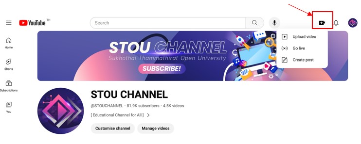 มองหาปุ่ม “Upload” ที่อยู่ทางขวาของแถบค้นหา (Search) บนหน้าแรกของ YouTube แล้วคลิกเพื่อเริ่มกระบวนการอัปโหลด