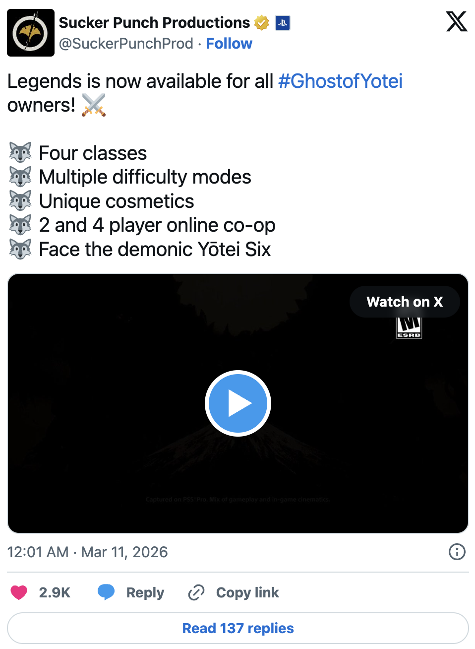 Sucker Punch Productions ได้ปล่อยโหมดมัลติเพลเยอร์ Ghost of Yotei Legends อย่างเป็นทางการแล้วในรูปแบบ DLC ฟรี สำหรับผู้ที่เป็นเจ้าของเกม Ghost of Yotei บน PS5 และ PS5 Pro โดยผู้เล่นสามารถเข้าเล่นโหมดนี้ได้ทันทีหลังจากอัปเดตเกมเป็น Patch 1.5