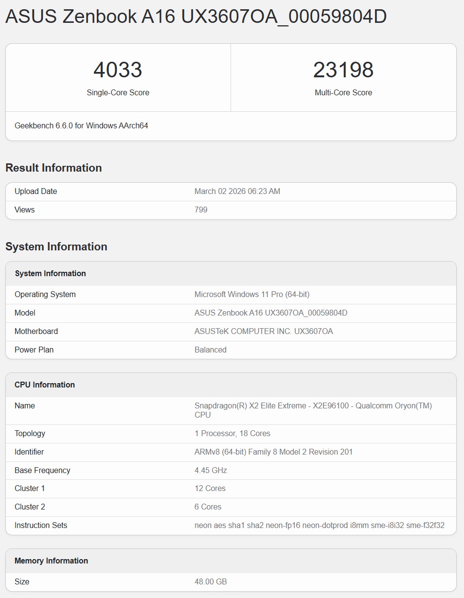 ผลทดสอบจาก Geekbench 6 แสดงให้เห็นว่า ชิปใหม่ของ Qualcomm แม้จะมี CPU ถึง 18 คอร์ และใช้ Oryon core รุ่นที่สาม แต่ยังคงแพ้ Apple Silicon รุ่นล่าสุดทั้งในด้าน single-core และ multi-core performance