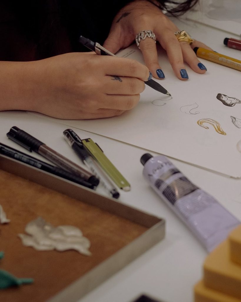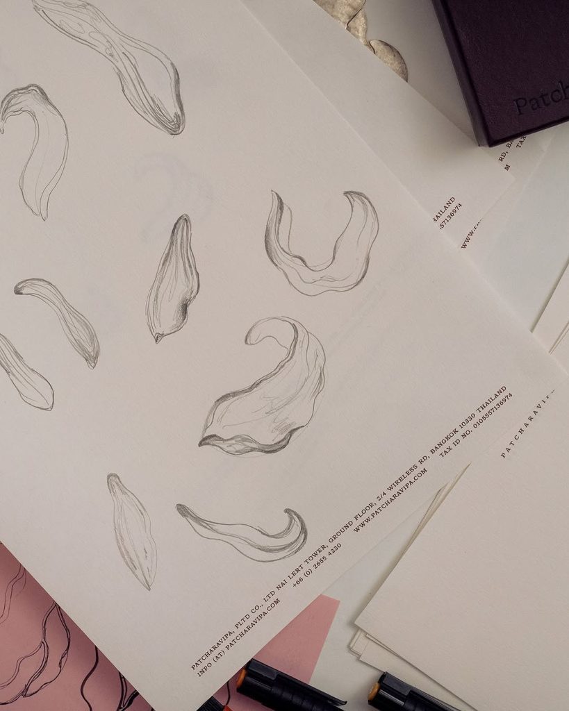 ดีไซเนอร์เล่าว่า การสร้าง Ear Cuff ชิ้นนี้คือการหาสมดุลระหว่าง “ธรรมชาติ” กับ “ความเป็นคอนเซ็ปต์” เธอเริ่มจากสเก็ตช์ วางแบบ ไปจนถึงปั้นพิมพ์ขี้ผึ้ง ปรับแก้หลายต่อหลายครั้ง จนได้รูปทรงใบแมกโนเลียในแบบที่รู้สึกว่า “ใช่” ทั้งในแง่อารมณ์และสไตล์ของ Aesop