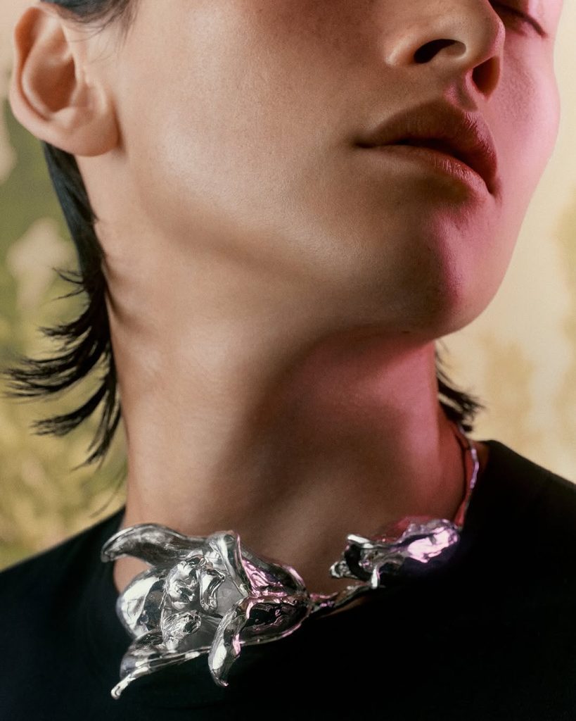 สร้อยคอโลหะรูปดอกแมกโนเลีย กลีบดูบอบบางอ่อนโยน แต่ใช้วัสดุแข็งแกร่ง สื่อถึงความขัดแย้งที่ลงตัวแบบเดียวกับคาแรกเตอร์ของน้ำหอม