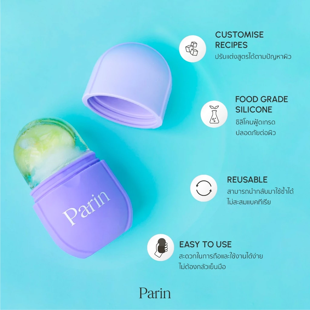 ใครเคยจับน้ำแข็งถูหน้าโดยตรงจะรู้ว่าเย็นจนมือชา แถมละลายเร็วมาก Parin ICE CUBE ออกแบบมาให้ถือถนัดมือ ลดความไม่สบายขณะใช้งาน