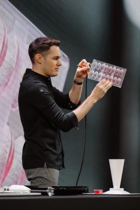 เขาค่อย ๆ โชว์ทุกขั้นตอนอย่างประณีต ตั้งแต่การเทช็อกโกแลต การขึ้นรูป ไปจนถึงรายละเอียดสุดท้ายที่ทำให้หนึ่งคำกลายเป็นประสบการณ์ที่ยากจะลืม