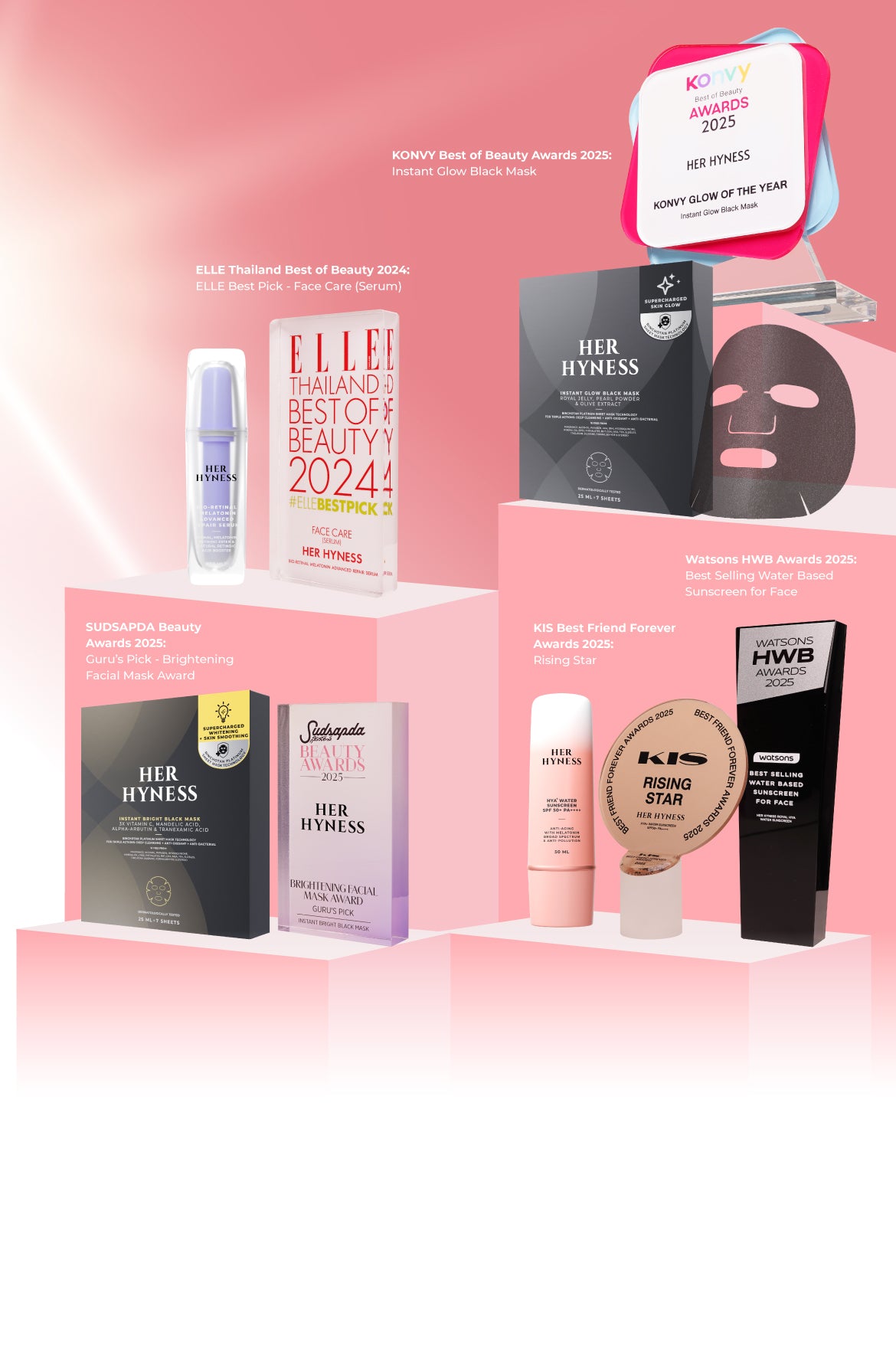 ในกลุ่มมาร์กหน้า แบรนด์เน้นทั้งการฟื้นฟูผิวอย่างเร่งด่วน เติมความชุ่มชื้น ลดริ้วรอย รวมถึงช่วยจัดการปัญหาสิวและความหมองคล้ำ เหมาะกับไลฟ์สไตล์ของคนยุคใหม่ที่ต้องการผลลัพธ์ชัดเจน รวดเร็ว แต่ยังปลอดภัยกับผิวในระยะยาว มาร์กหน้า HER HYNESS จึงตอบโจทย์ทั้งในแง่ ส่วนผสมสะอาด, การผ่านการทดสอบทางการแพทย์ และ รีวิวจากผู้ใช้จริง ที่กลับมาซื้อซ้ำต่อเนื่อง