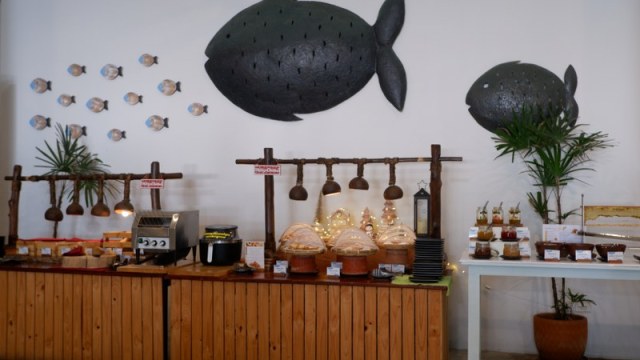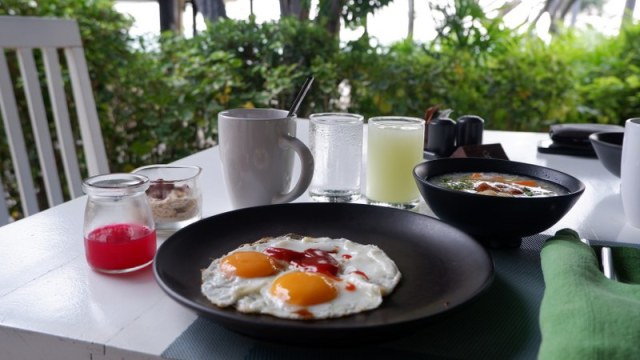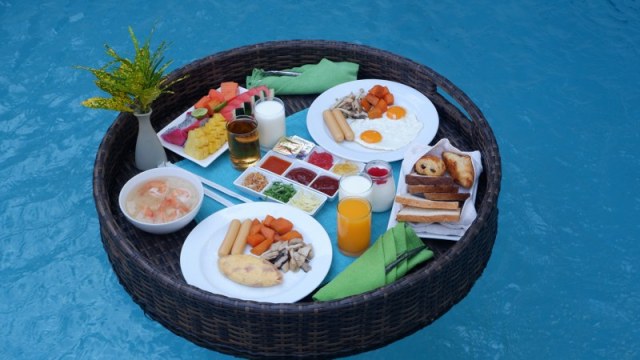 ไฮไลต์หนึ่งคือบริการ floating breakfast เสิร์ฟอาหารเช้าถาดลอยกลางสระในวิลล่าของเราเอง ถ้าอยากอิ่มแบบจริงจังต่อ ก็เดินไปบุฟเฟต์อาหารเช้าของรีสอร์ตได้เลย เพราะไลน์อาหารอลังการเกินคาด