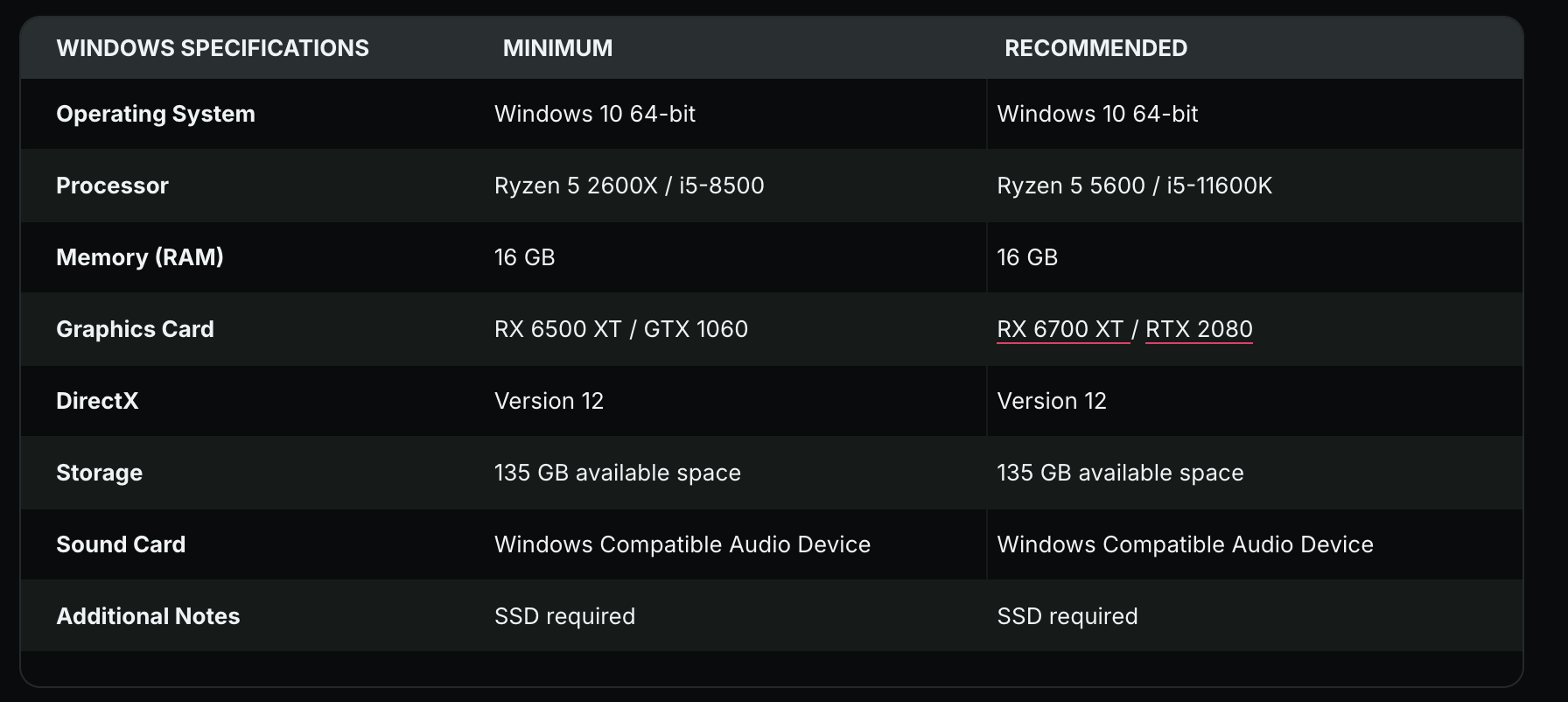 เกมต้องการพื้นที่ถึง 135 GB และจำเป็นต้องใช้ SSD ทั้งบน Windows และ macOS ซึ่งสะท้อนขนาดและความละเอียดของโลกในเกมได้ชัดเจน