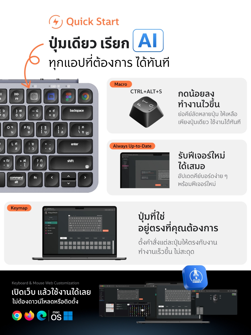 เทรนด์การปรับแต่งคีย์บอร์ดกำลังมาแรง รุ่นนี้รองรับ Keychron Launcher ที่ใช้ผ่านเว็บได้ ไม่ต้องติดตั้งโปรแกรมบนเครื่อง จึงสะดวกมากสำหรับผู้ใช้ที่ไม่อยากโหลดซอฟต์แวร์เพิ่มให้หนักเครื่องหรือกินทรัพยากร
