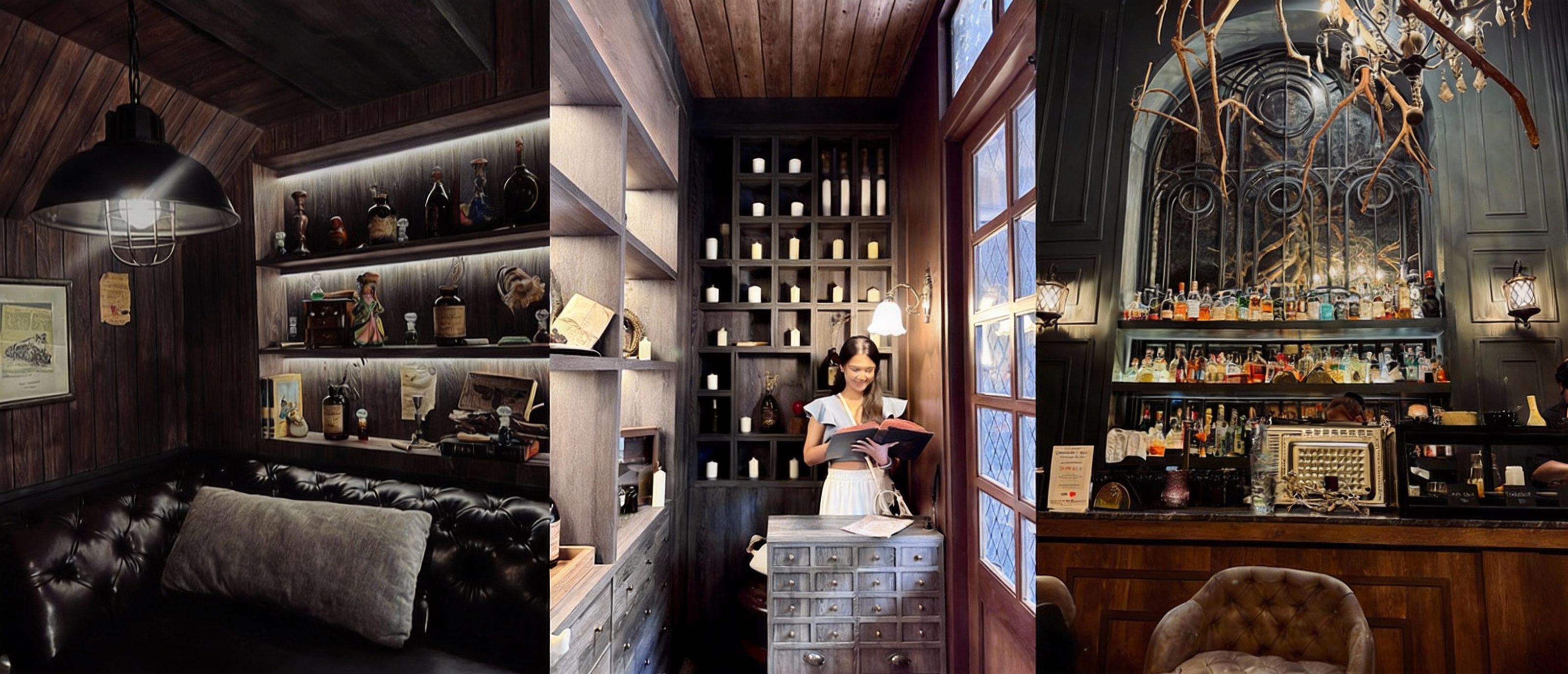 แค่ผลักประตูเข้ามาก็เจอตู้โชว์สไตล์โลกเวทมนตร์ ถ่ายรูปออกมาปังทุกมุม ต่อด้วยเคาน์เตอร์บาร์ที่เรียงขวดสีสันเหมือนตั้งใจจัดเป็นพร็อพให้ถ่ายเล่น สายคอนเทนต์ถูกใจแน่นอน