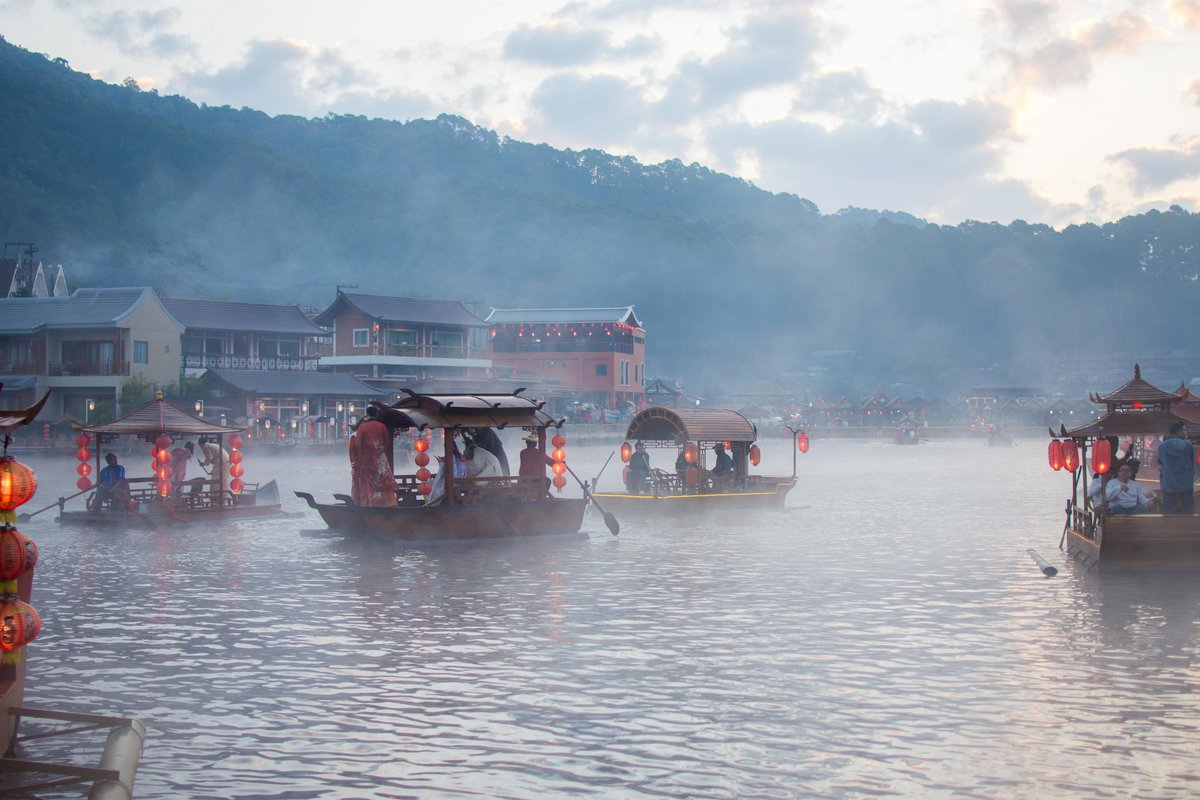 เมื่อฟ้าเริ่มสว่าง หมอกลอยเหนือผิวน้ำแบบบางๆ ผสมกับควันจากเรือและบ้านคน กลายเป็นบรรยากาศที่หายากในเมืองไทย