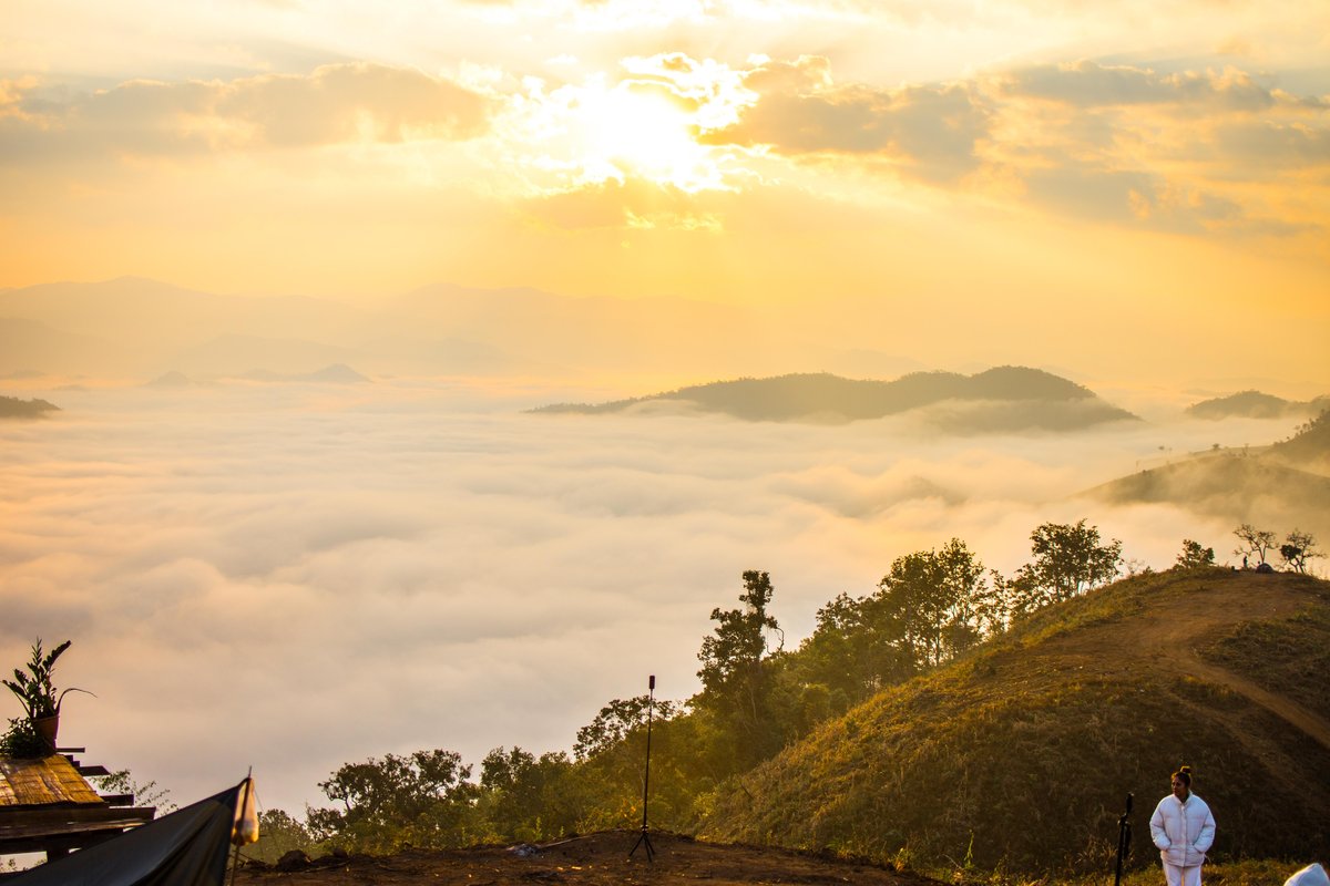 พอมาถึงลานกางเต็นท์มอเดาะโข๋ สิ่งแรกที่ได้ทำคืออ้าปากค้าง เพราะทิวเขาและทะเลหมอกตรงหน้าสวยแบบเลเวลสุดของทริปเช้านี้เลย