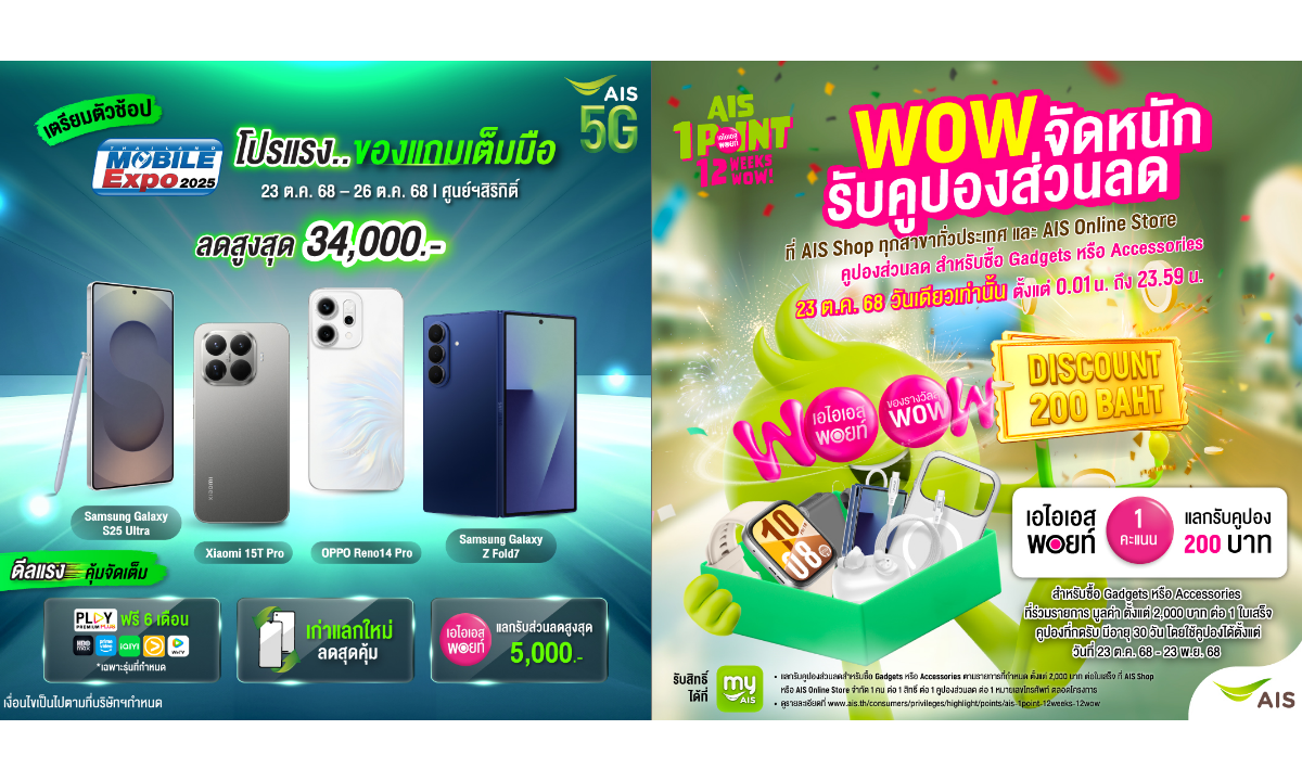 ที่พีคไปกว่านั้น ในโอกาสครบรอบ 35 ปี เอไอเอสจัดแคมเปญพิเศษ ใช้เพียง AIS Points 1 คะแนน แลกรับส่วนลด 200 บาท สำหรับซื้อสินค้ากลุ่ม Gadget หรือ Accessories มูลค่า 2,000 บาทต่อใบเสร็จ เรียกว่าซื้อของอัปเกรดชีวิตดิจิทัลทั้งบ้านได้ในราคาเบากว่าที่คิด