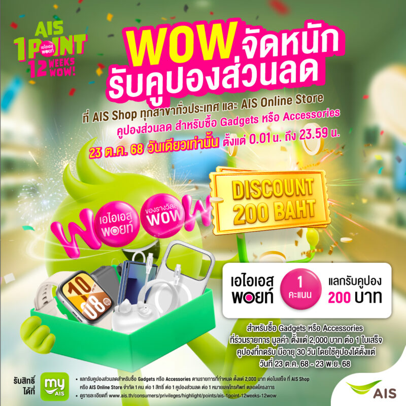เอไอเอสยังจัดแคมเปญใหญ่ “AIS 1 POINT 12 WEEKS 12 WOW” ให้ลูกค้าใช้คะแนนน้อย แต่ได้ความคุ้มแบบจัดหนัก โดยรอบนี้เน้นเอาใจสาย Gadget และ Accessories เป็นพิเศษ