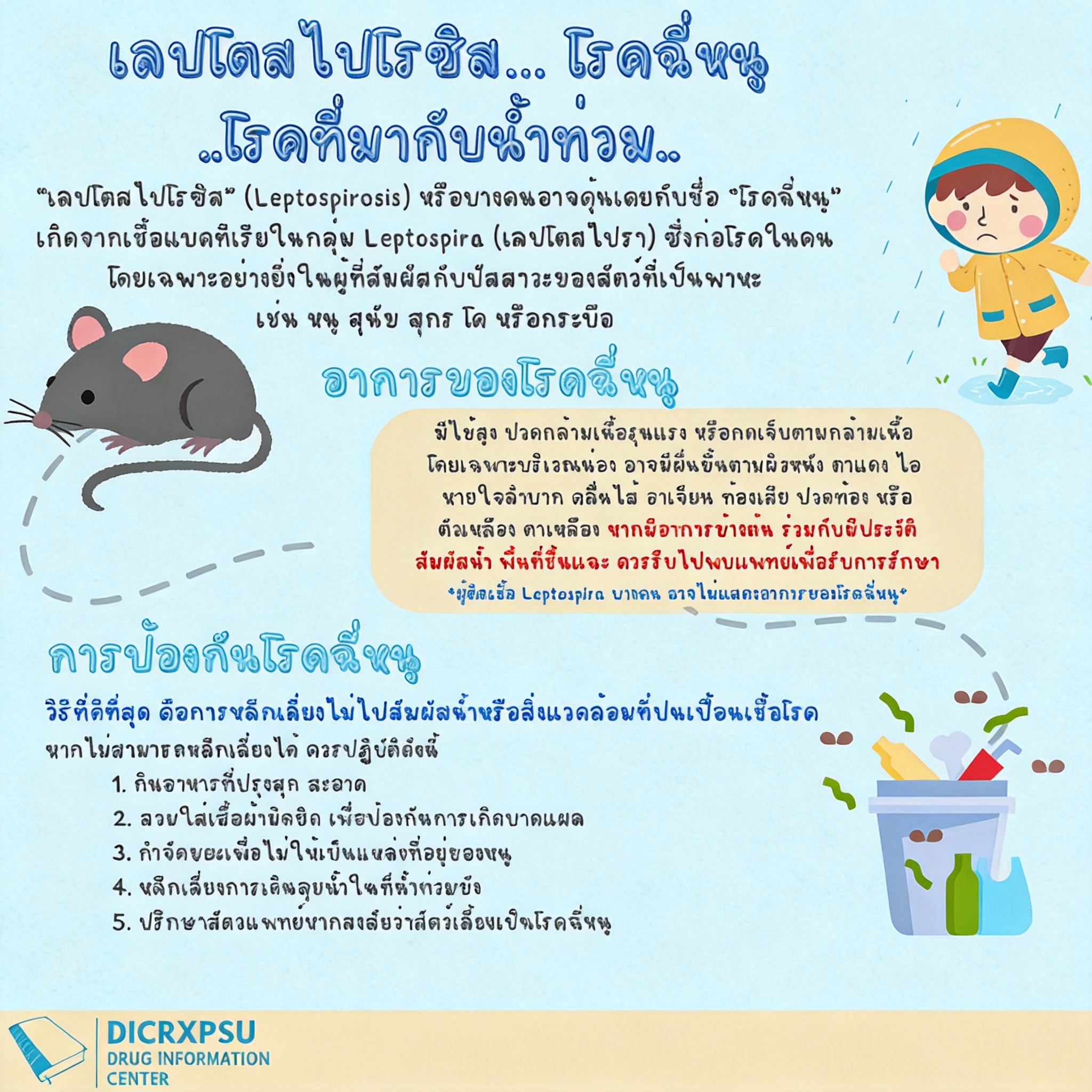 หัวใจสำคัญของการป้องกันโรคฉี่หนู คือ “อย่าปล่อยให้ตัวเองต้องไปสัมผัสน้ำหรือสิ่งแวดล้อมที่มีโอกาสปนเปื้อนเชื้อ”