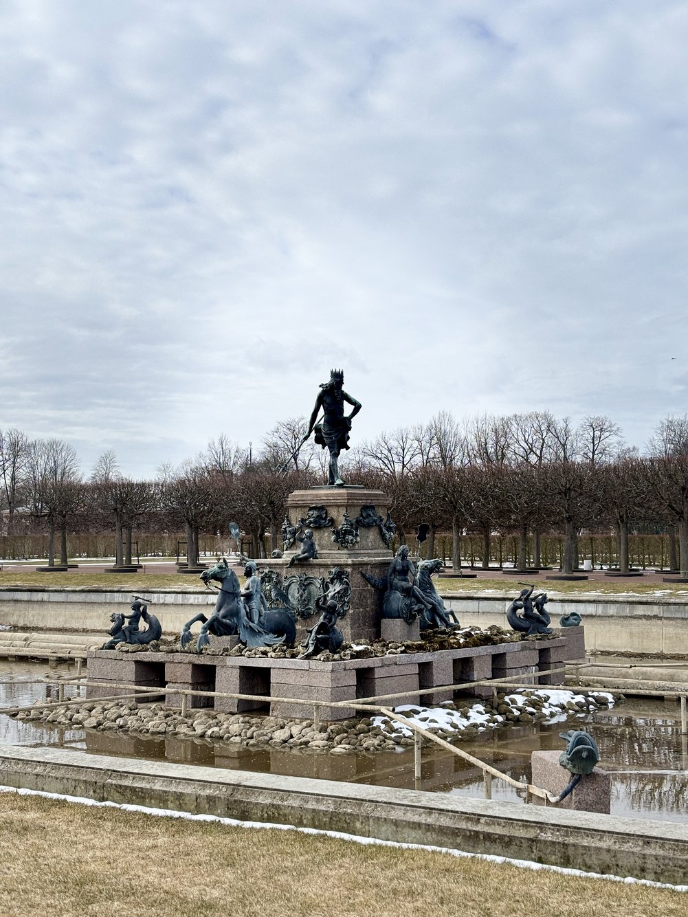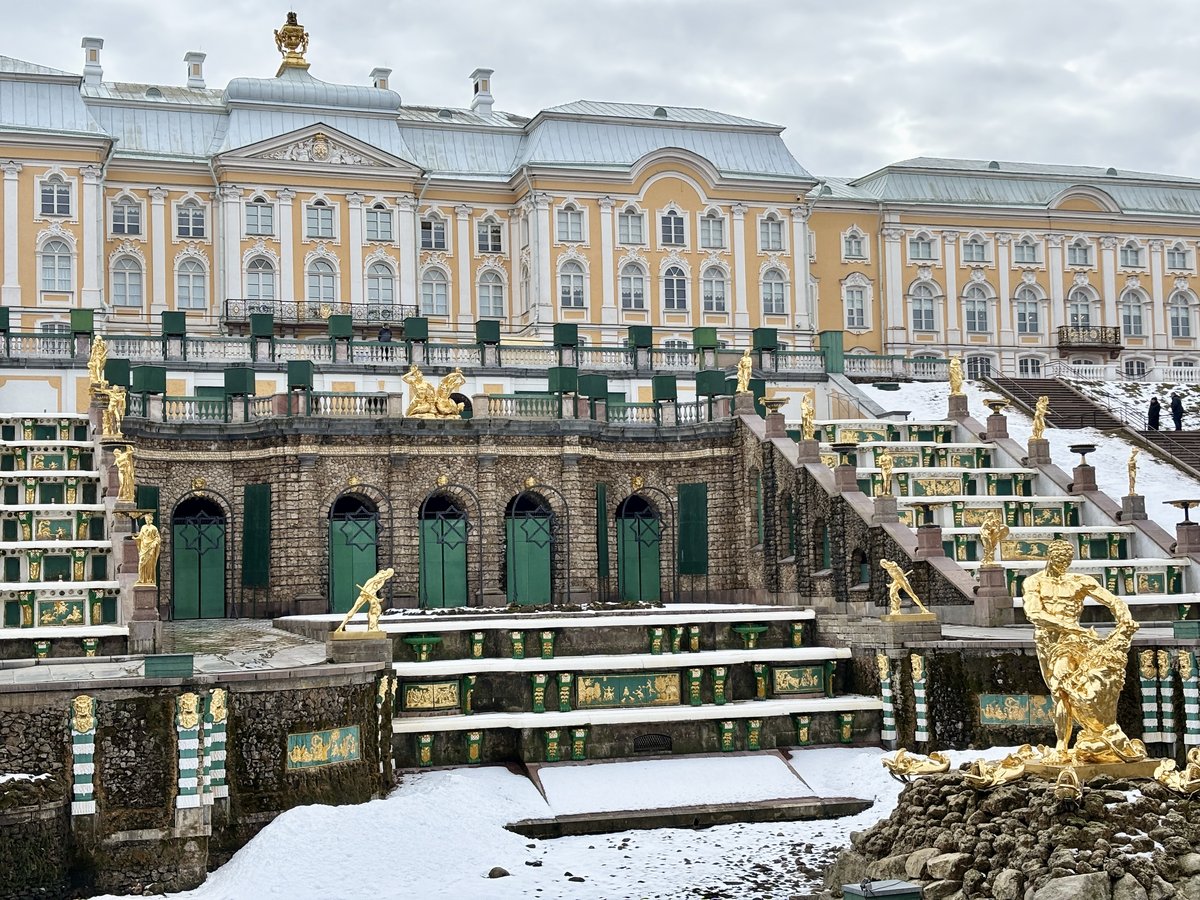 ถึงตัวพระราชวัง Peterhof ในหน้าหนาว สวนด้านนอกเต็มไปด้วยหิมะแทนที่จะเป็นดอกไม้และน้ำพุ ทำให้วันนี้ เข้าสวนฟรี ส่วนการเข้าตัวพระราชวังภายในต้องซื้อบัตรต่างหาก