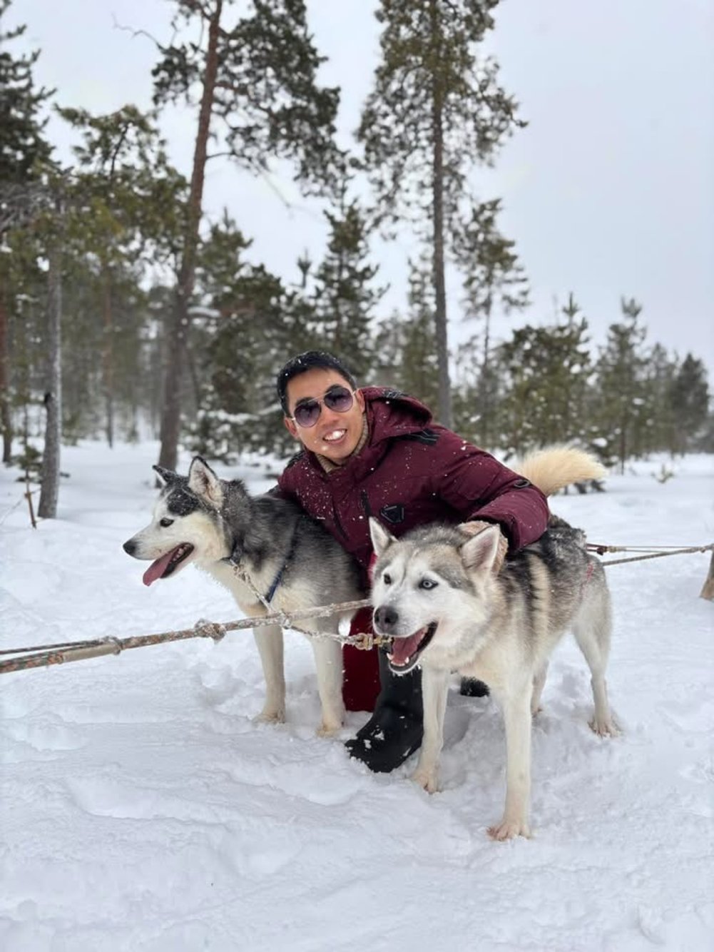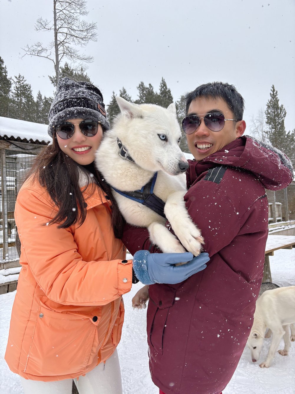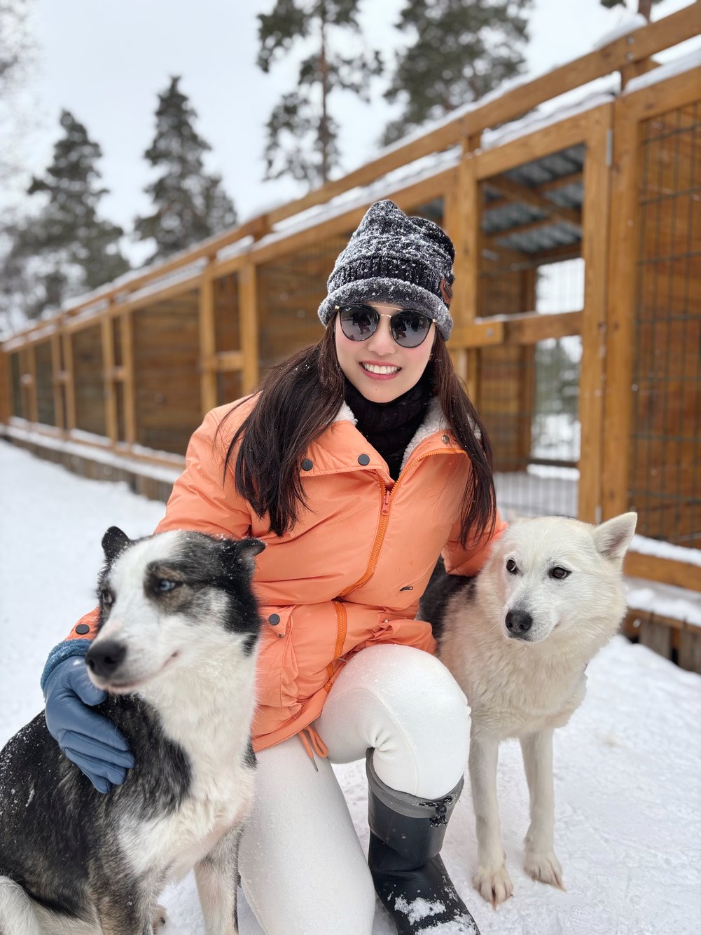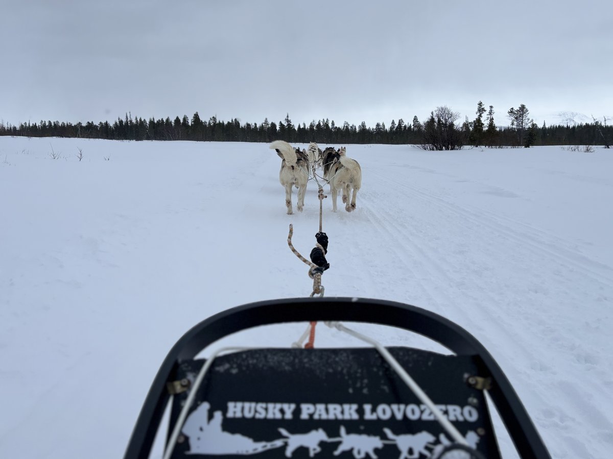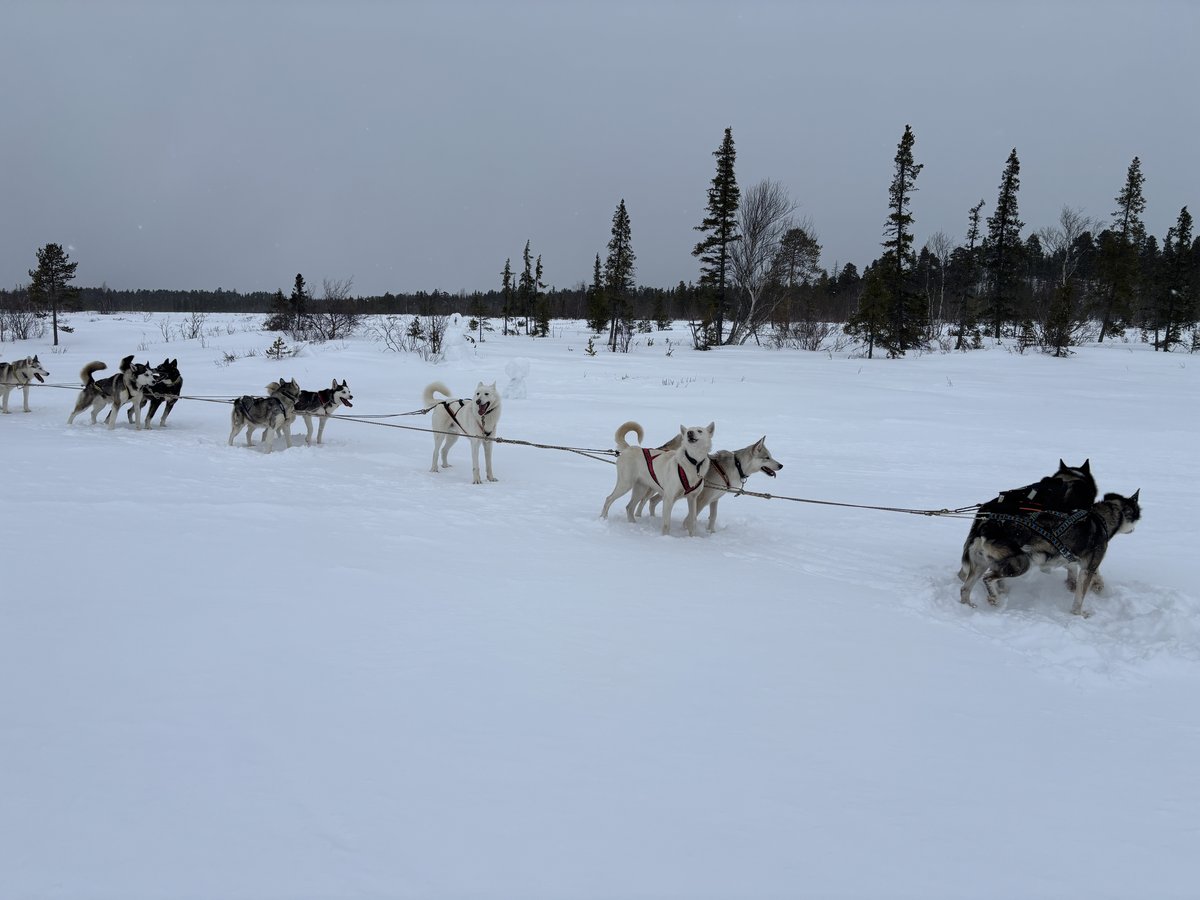 ทีเด็ดคือการนั่งเลื่อนสุนัขลาก หิมะขาว หนาวจัดแต่หัวใจฟูสุด รถหนึ่งคันนั่ง 2 คน ใช้น้องไซบีเรียนฮัสกี้ถึง 10 ตัววิ่งนำ พอเริ่มวิ่งจริงๆ ทุกตัวสามัคคีกันดีมาก