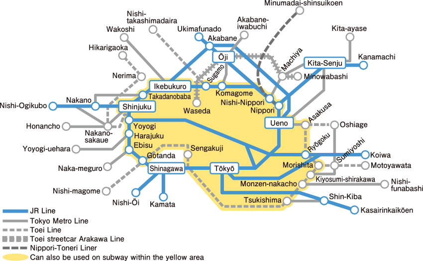 พื้นที่และเส้นทางที่ใช้ได้กับ Tokyo 1-Day Ticket