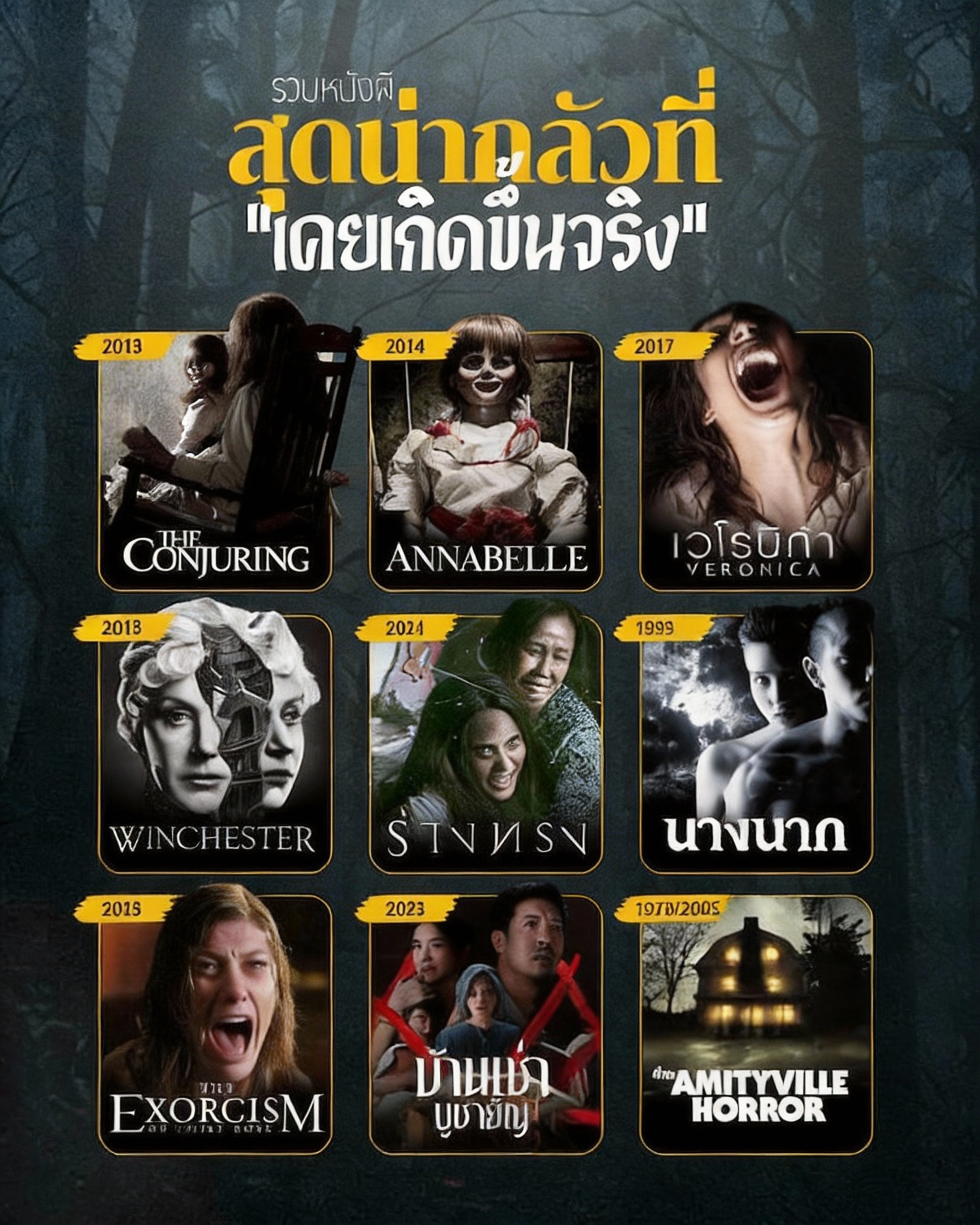 ทีมเราเลยรวบรวมหนังผีสยองที่ใช้ แฟ้มคดีปริศนา เหตุอาถรรพ์ และตำนานหลอนจริง มาเป็นเชื้อเพลิง จุดไฟความกลัวให้ลุกท่วมจอ ตั้งแต่คดีดังของ Ed & Lorraine Warren บ้านต้องสาป พิธีไล่ผี ไปจนถึงตำนานผีไทยที่เล่าขานกันมาหลายชั่วอายุคน