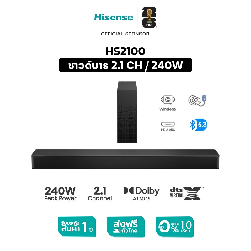 Hisense HS2100 คือซาวด์บาร์ระบบเสียง 2.1 Channel ที่ประกอบด้วยลำโพงหลักแบบ Soundbar และซับวูฟเฟอร์สำหรับเสียงเบสโดยเฉพาะ ให้พลังเสียงรวมสูงสุด 240 วัตต์