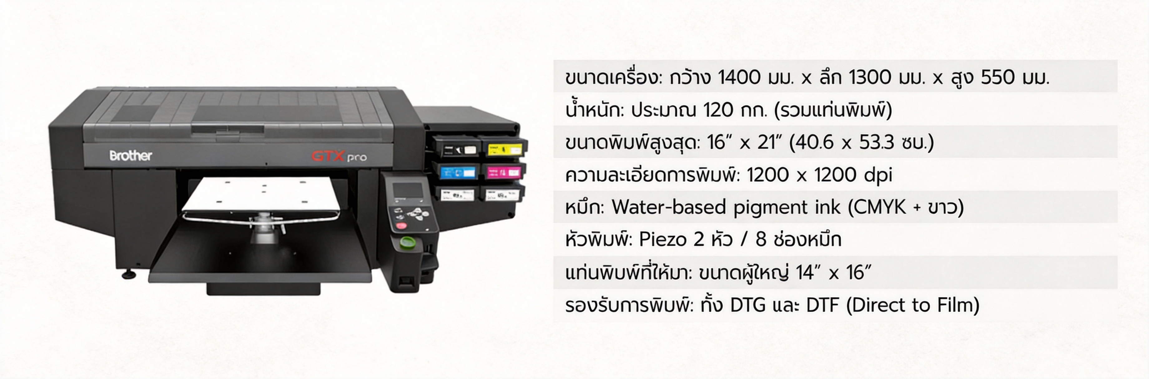 ชนิดน้ำหมึก: หมึกพิกเมนต์แบบน้ำ (Water-based pigment ink) รองรับสี CMYK พร้อมหมึกสีขาวสำหรับพื้นเข้ม