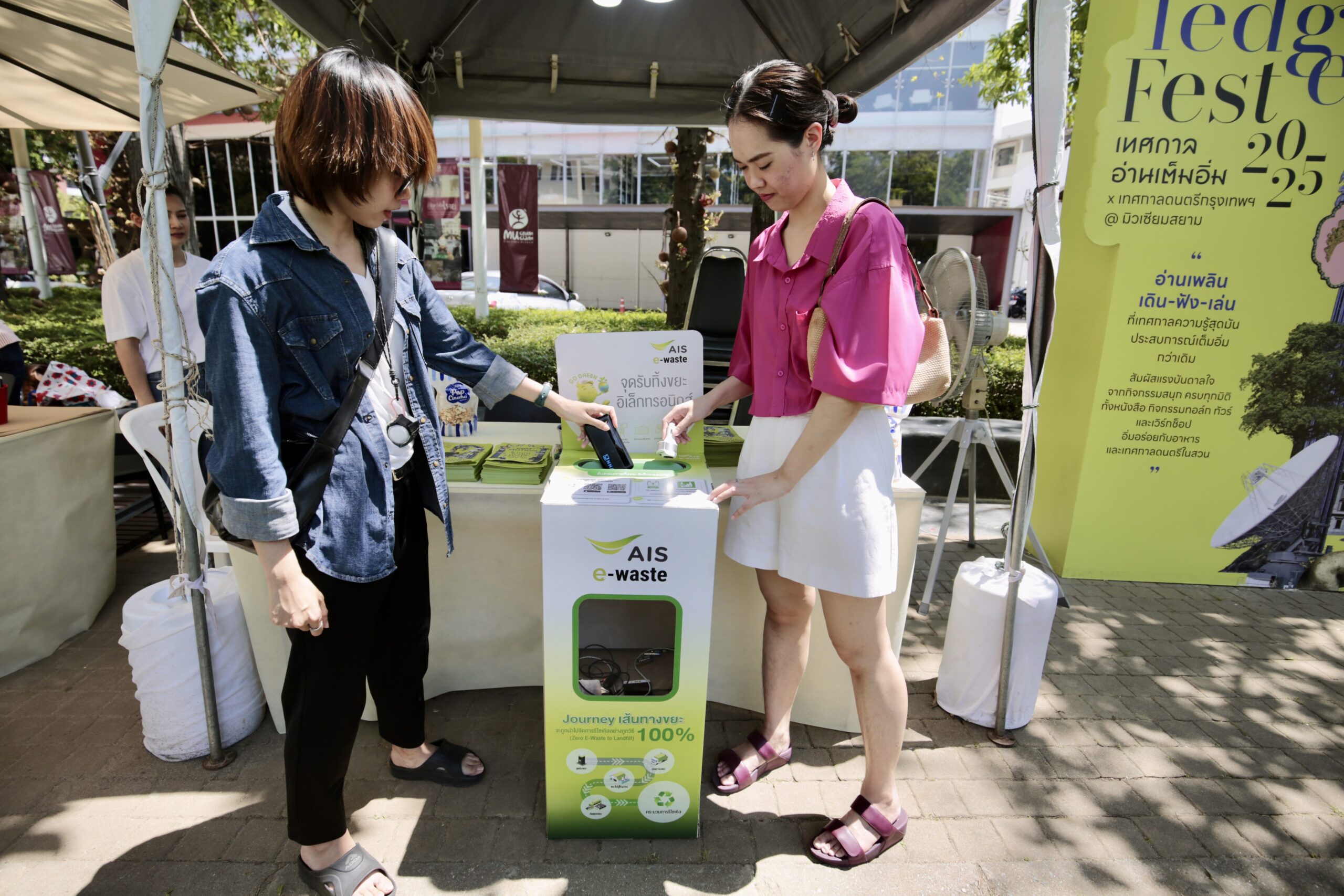 ด้านภารกิจรักษ์โลก AIS ก็มาตั้งจุดรับ E-Waste เปิดให้ทุกคนนำขยะอิเล็กทรอนิกส์อย่างโทรศัพท์เก่า สายชาร์จ หูฟัง เมาส์ คีย์บอร์ด มาฝากรีไซเคิล เพื่อลดปัญหาขยะยุคดิจิทัลที่กำลังโตเร็วแบบน่ากังวล