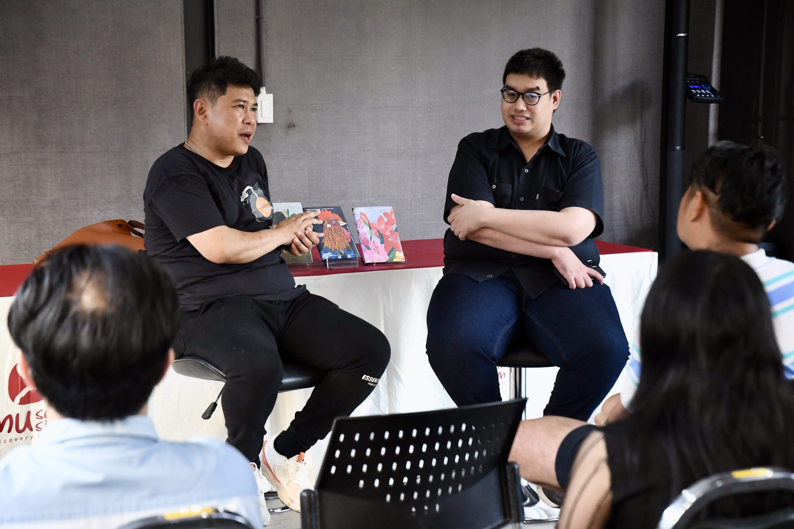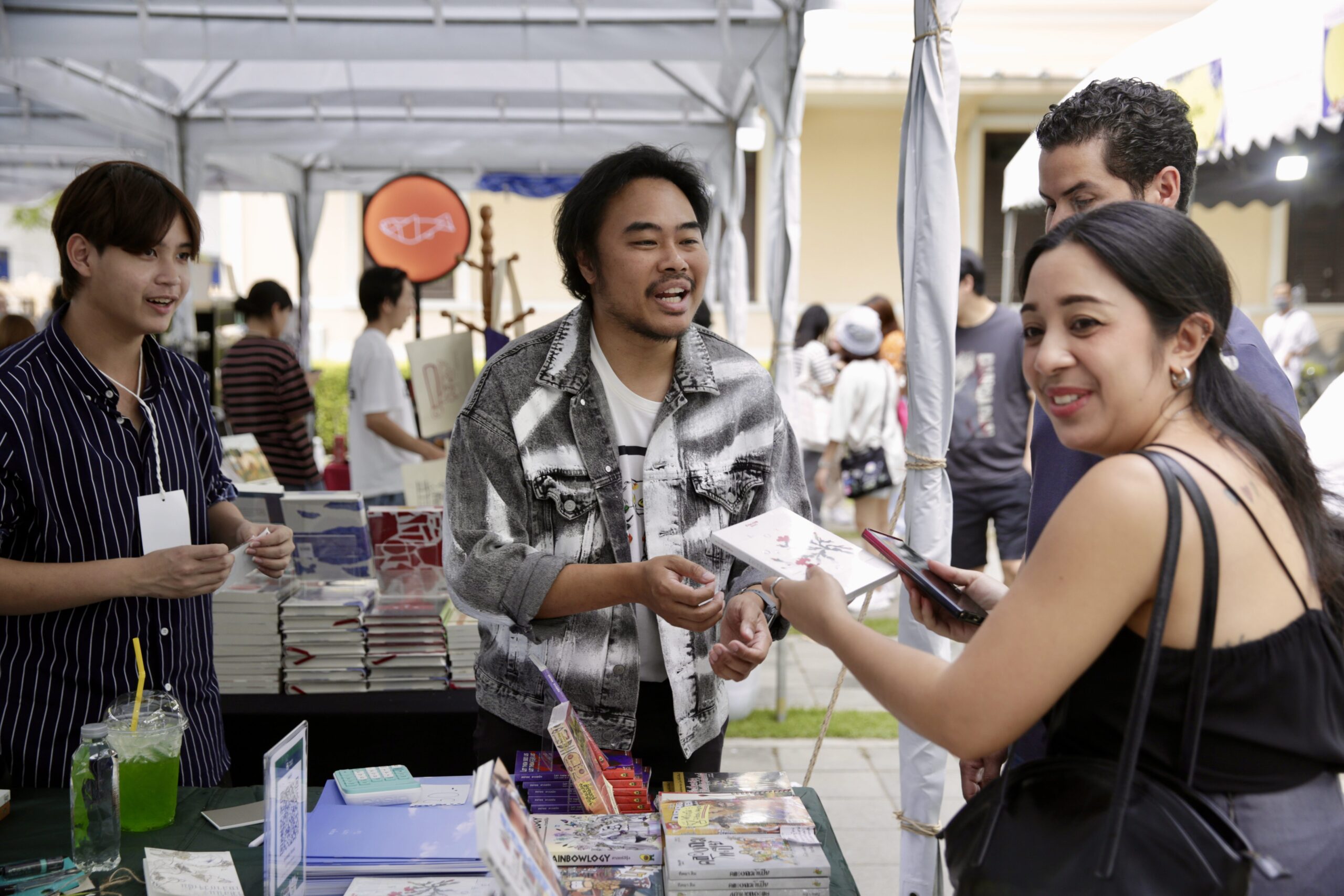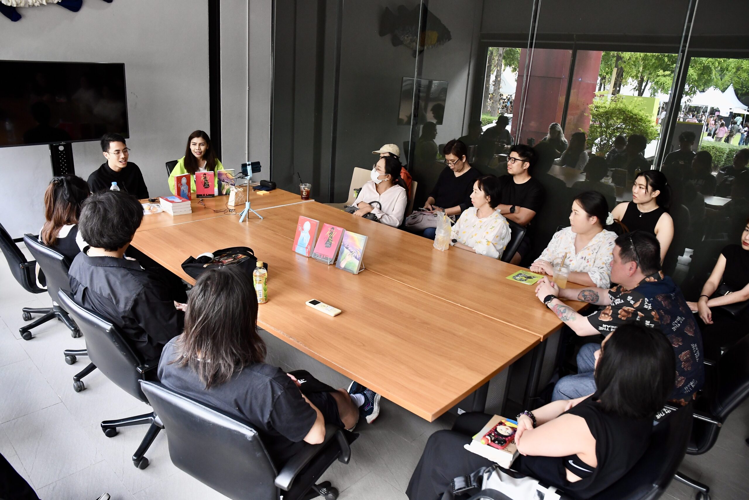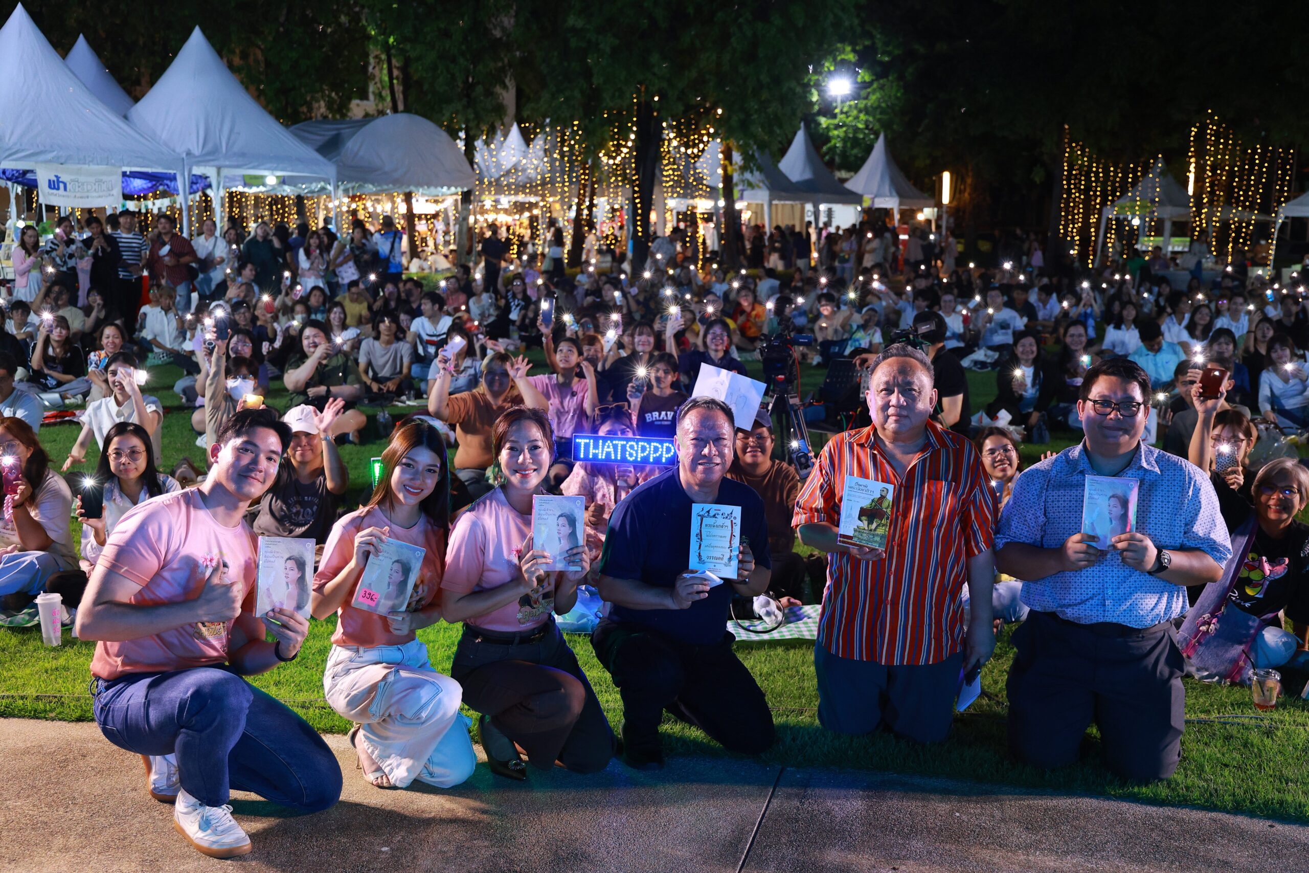 หนึ่งในไฮไลต์คือเวที BookTalk หัวข้อ ‘จักรวาลไทบ้าน: จุดเริ่มต้นไทบ้าน และก้าวต่อไปสู่ระดับโลก’ ที่ทีมผู้สร้างเล่ากันแบบไม่มีกั๊ก ตั้งแต่วันฉายรอบสื่อที่ไฟล์ยังตัดต่อไม่สมบูรณ์ ต้องแก้เกมแข่งกับเวลา ตัดต่อกันบนเครื่องบิน ย้ายคอมกว่า 40 เครื่องไปอัปไฟล์ในร้านเกม และไม่ได้นอนหลายคืนกว่าจะดันหนังขึ้นจอทันกำหนด