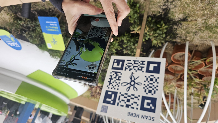 ผู้ชมสแกน QR Code จากบอร์ดนิทรรศการเพื่อเล่น AR ทำการปักหมุดเฉลว ณ Thailand Pavilion