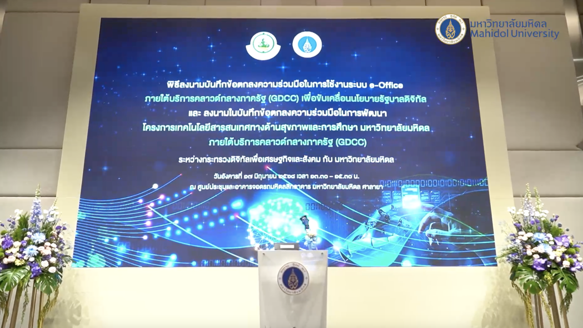 พิธีลงนามบันทึกข้อตกลงความร่วมมือในการใช้งานระบบ e-Office บนบริการคลาวด์กลางภาครัฐ (GDCC) ระหว่างมหาวิทยาลัยมหิดล และกระทรวงดิจิทัลเพื่อเศรษฐกิจและสังคม จัดขึ้นเมื่อวันที่ 17 มิถุนายน 2568 เพื่อยกระดับการบริหารจัดการภายในมหาวิทยาลัย และขับเคลื่อนการประยุกต์ใช้เทคโนโลยีดิจิทัลในระดับประเทศอย่างเป็นรูปธรรม