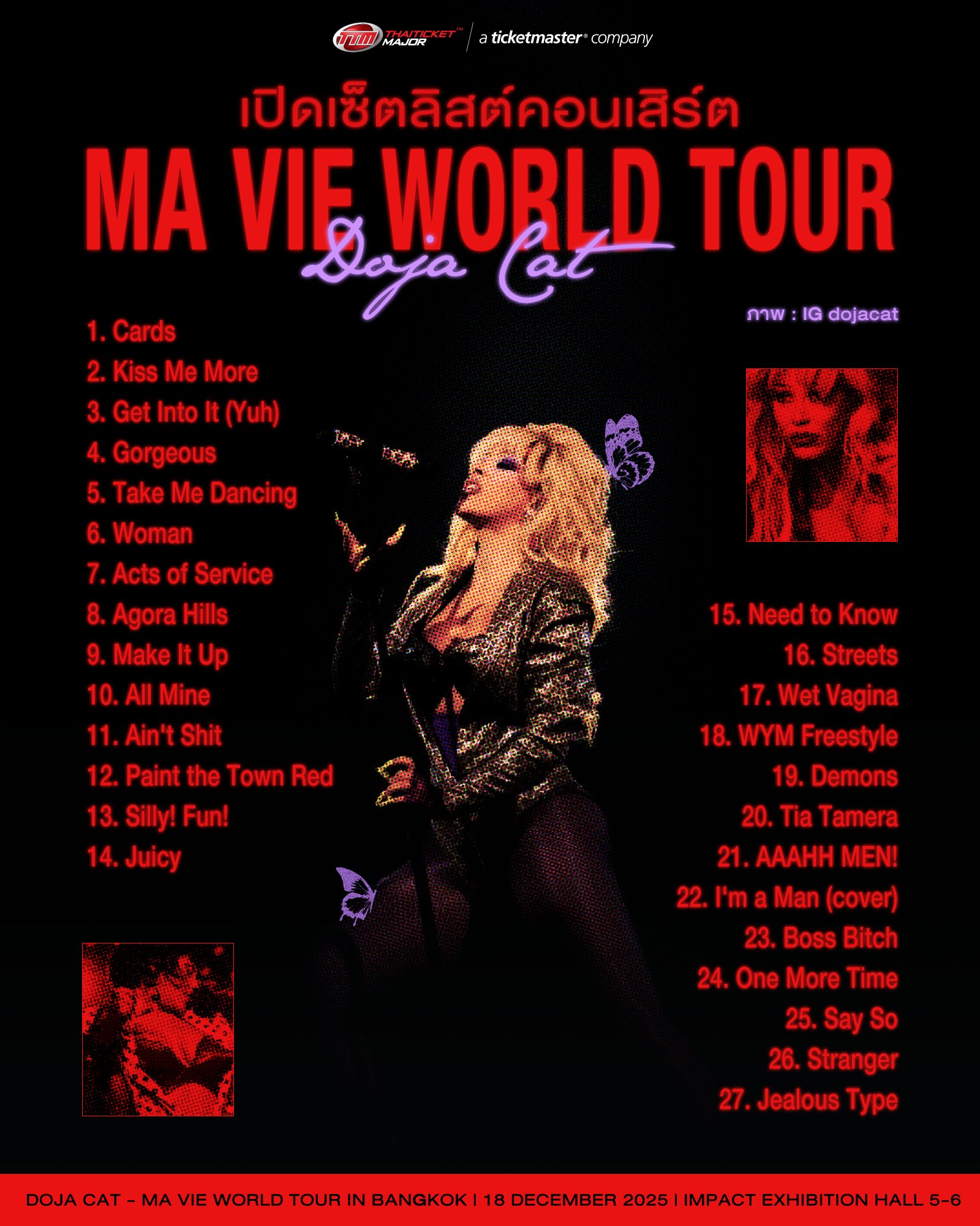 ถ้าจะมีคอนเสิร์ตปลายปีสักงานที่ถูกพูดถึงมากที่สุดในหมู่สายป๊อป สายฮิปฮอป และสายตัวแม่ ค่ำคืนนั้นต้องยกให้ Doja Cat – Ma Vie World Tour คอนเสิร์ตเดี่ยวครั้งแรกในประเทศไทยของ “ยัยแมว” Doja Cat ที่จัดขึ้นเมื่อวันที่ 18 ธันวาคม 2568 ณ อิมแพ็ค เอ็กซิบิชั่น ฮอลล์ 5-6